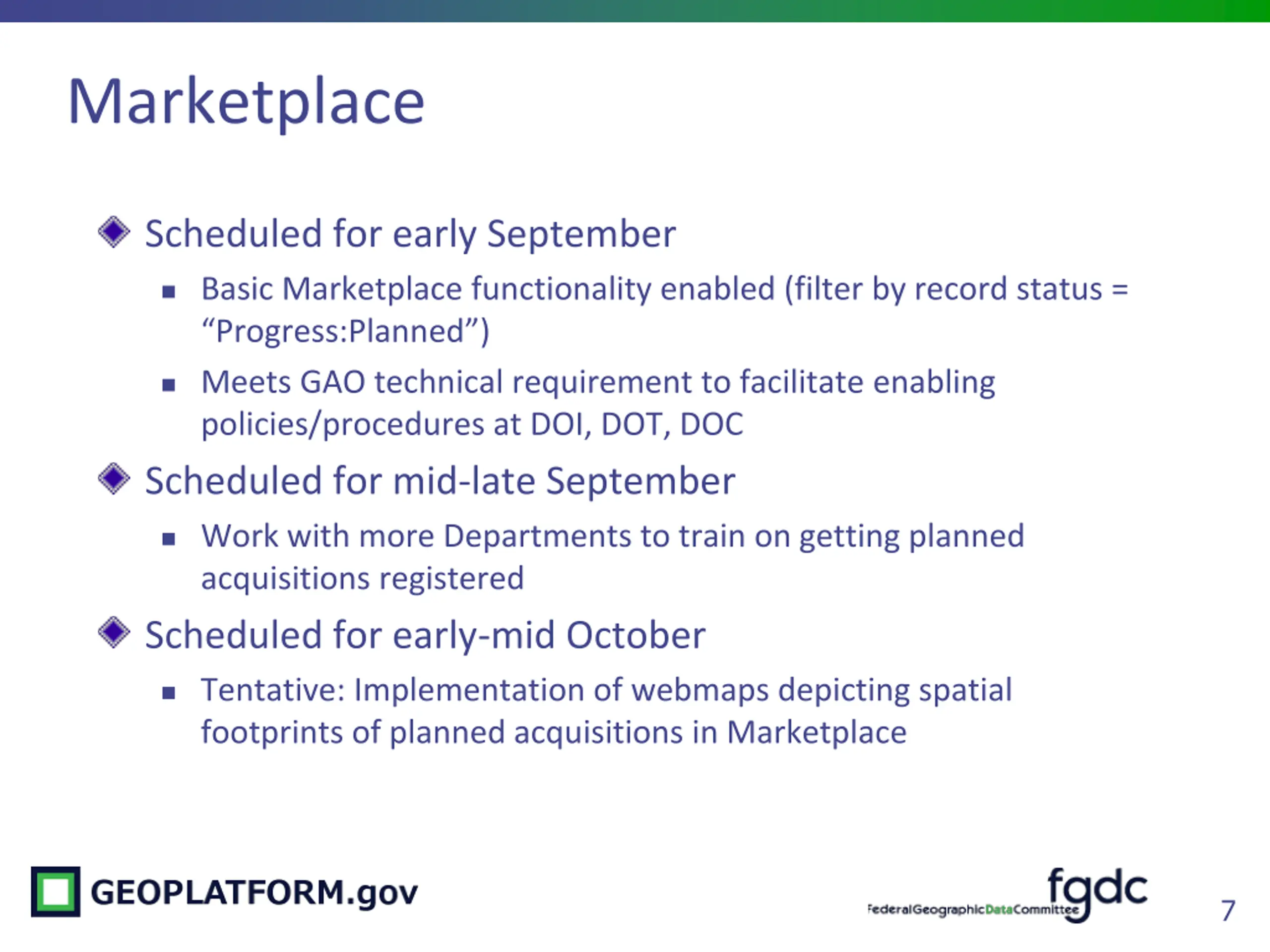 Marketplace Scheduled for early September Basic Marketplace functionality enabled (filter by record status = Progress:Planned ) Meets GAO technical requirement to facilitate enabling policies/procedures at DOI, DOT, DOC Scheduled for mid-late September Work with more Departments to train on getting planned acquisitions registered Scheduled for early-mid October Tentative: Implementation of webmaps depicting spatial footprints of planned acquisitions in Marketplace 7