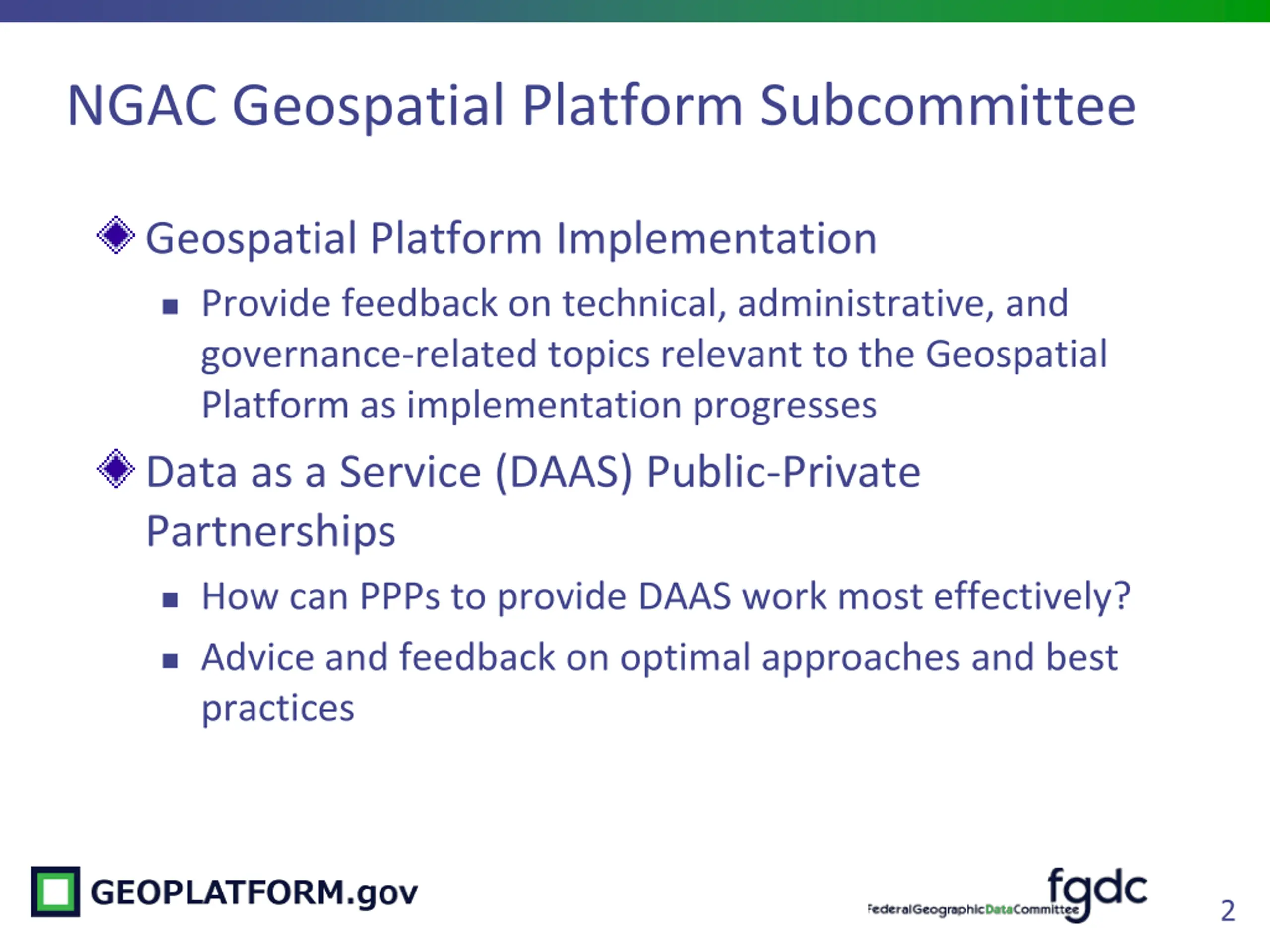NGAC Geospatial Platform Subcommittee Geospatial Platform Implementation Provide feedback on technical, administrative, and governance-related topics relevant to the Geospatial Platform as implementation progresses Data as a Service (DAAS) Public-Private Partnerships How can PPPs to provide DAAS work most effectively? Advice and feedback on optimal approaches and best practices 2