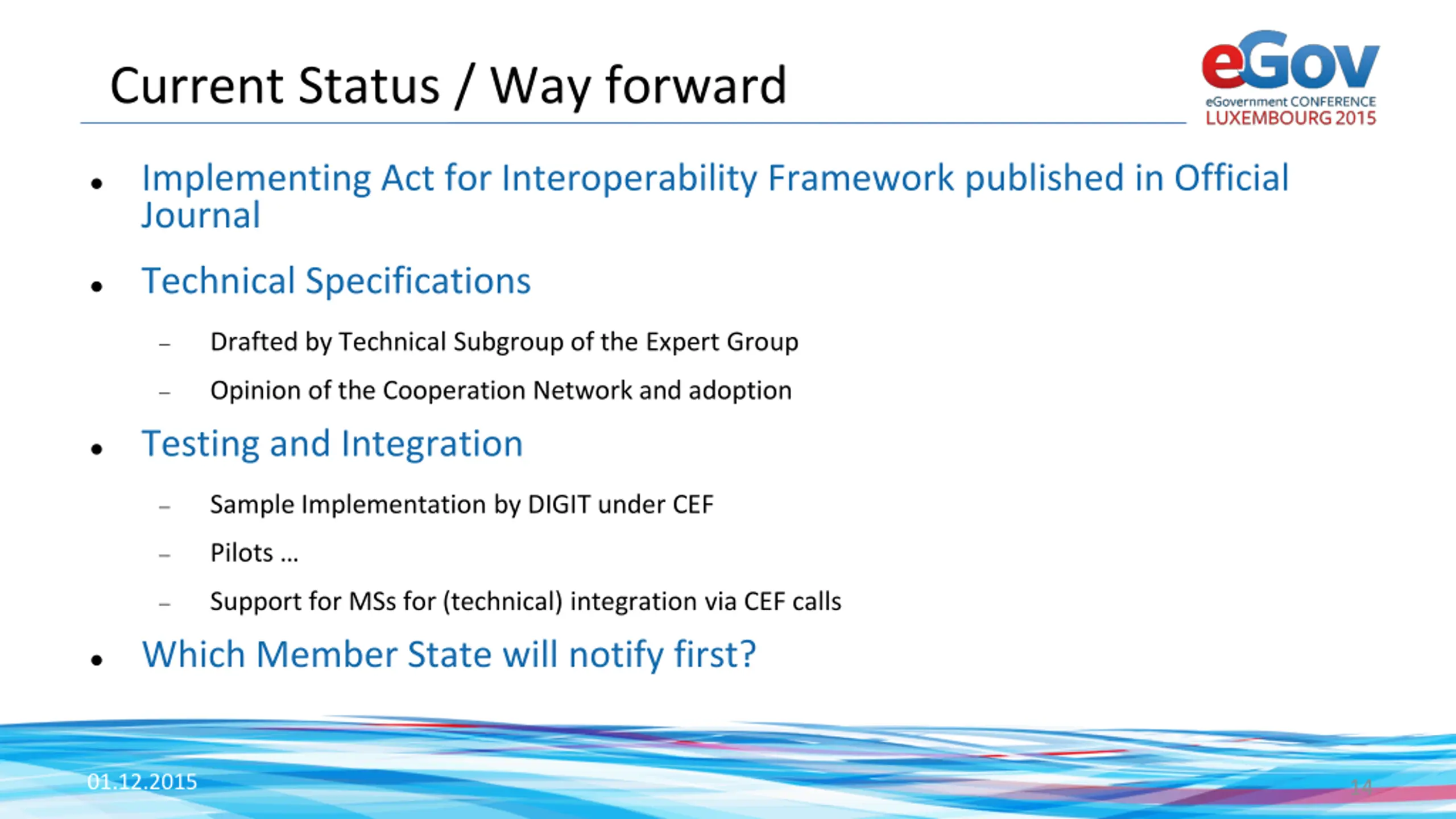 Current Status / Way forward Implementing Act for Interoperability Framework published in Official Journal Technical Specifications Drafted by Technical Subgroup of the Expert Group Opinion of the Cooperation Network and adoption Testing and Integration Sample Implementation by DIGIT under CEF Pilots Support for MSs for (technical) integration via CEF calls Which Member State will notify first? 01.12.2015 14