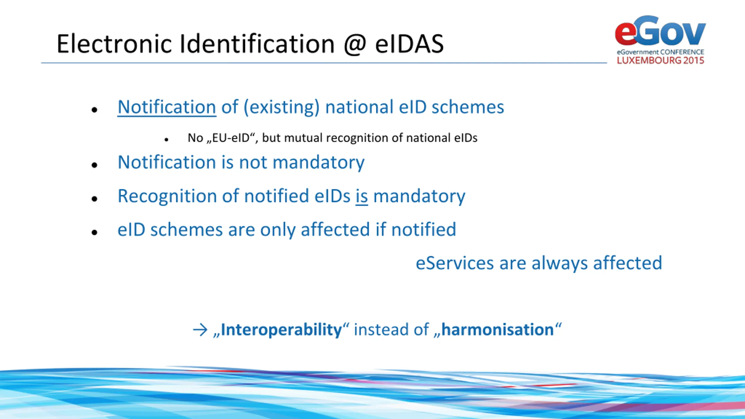 Electronic Identification @ eIDAS Notification of (existing) national eID schemes No EU-eID , but mutual recognition of national eIDs Notification is not mandatory Recognition of notified eIDs is mandatory eID schemes are only affected if notified eServices are always affected Interoperability instead of harmonisation