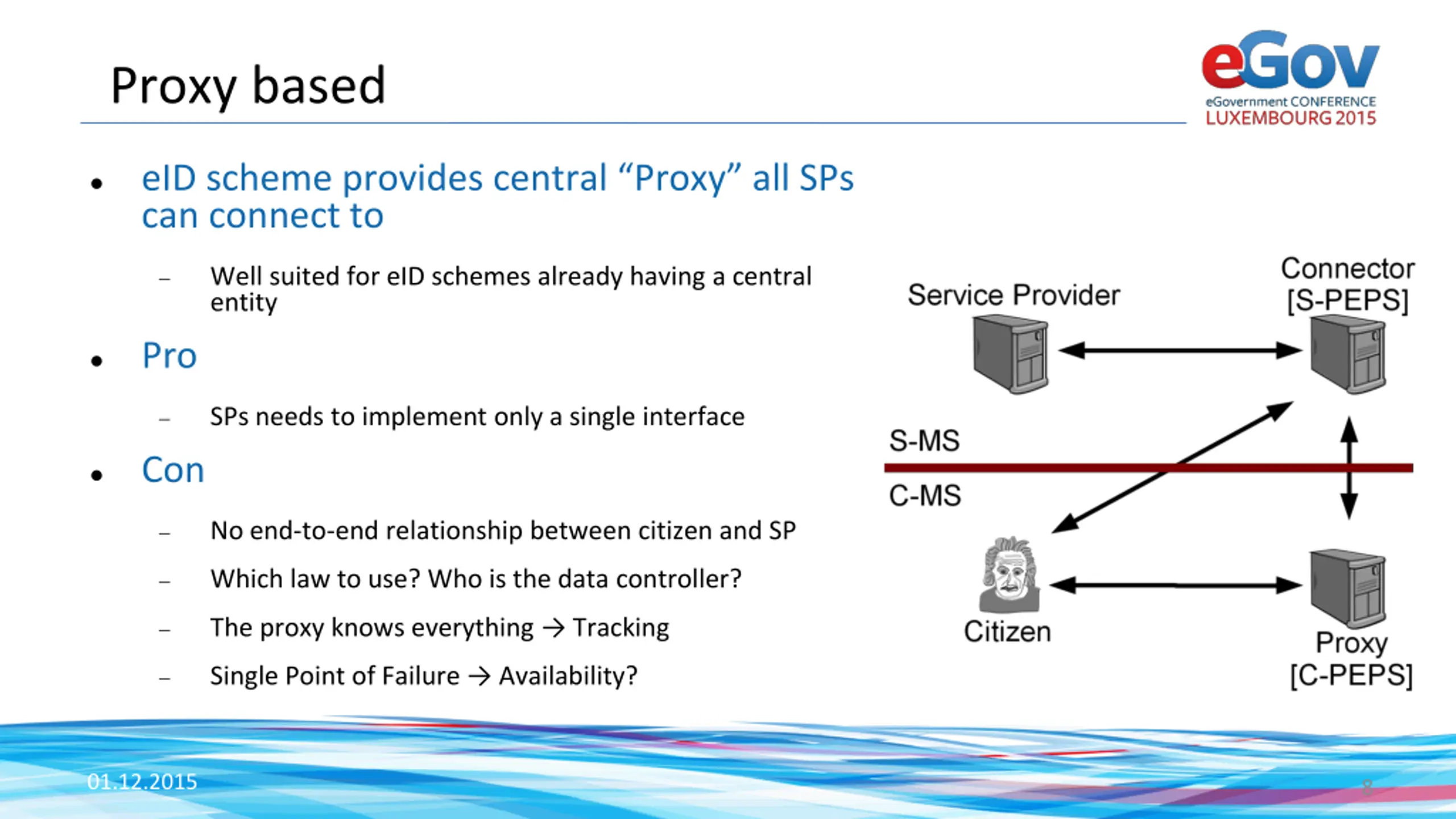 Proxy based eID scheme provides central Proxy all SPs can connect to Well suited for eID schemes already having a central entity Pro SPs needs to implement only a single interface Con No end-to-end relationship between citizen and SP Which law to use? Who is the data controller? The proxy knows everything Tracking Single Point of Failure Availability? 01.12.2015 8