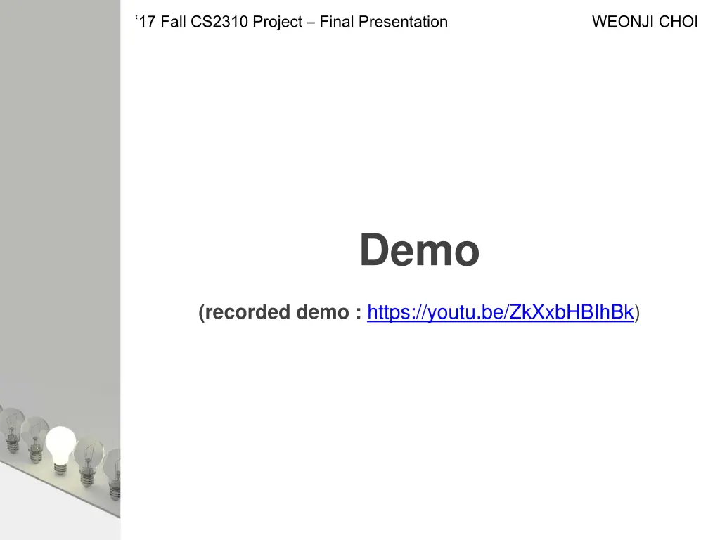 17 Fall CS2310 Project Final Presentation WEONJI CHOI Demo (recorded demo : https://youtu.be/ZkXxbHBIhBk)