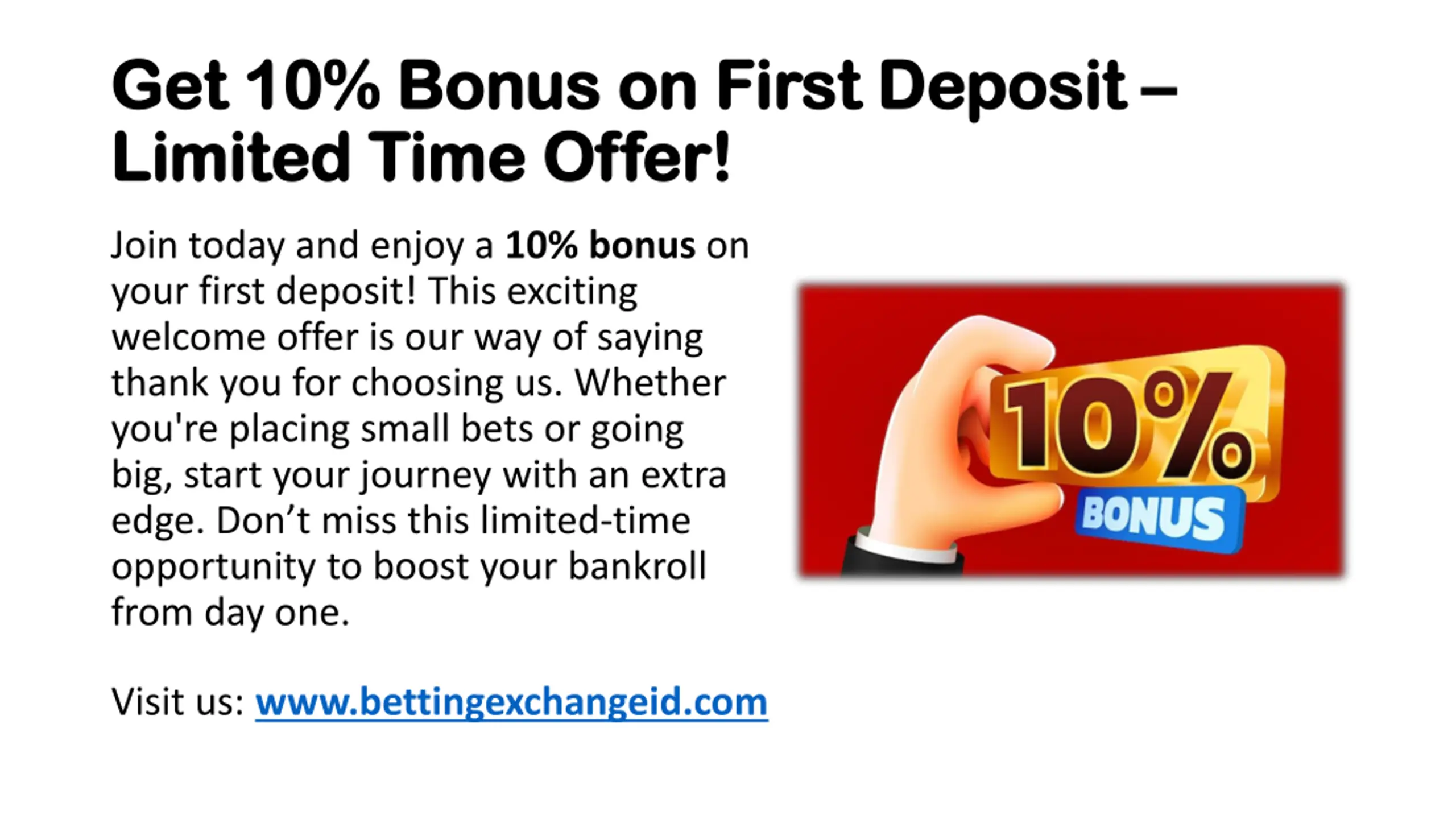 Get 10% Bonus on First Deposit Get 10% Bonus on First Deposit Limited Time Offer! Limited Time Offer! Join today and enjoy a 10% bonus on your first deposit! This exciting welcome offer is our way of saying thank you for choosing us. Whether you're placing small bets or going big, start your journey with an extra edge. Don t miss this limited-time opportunity to boost your bankroll from day one. Visit us: www.bettingexchangeid.com