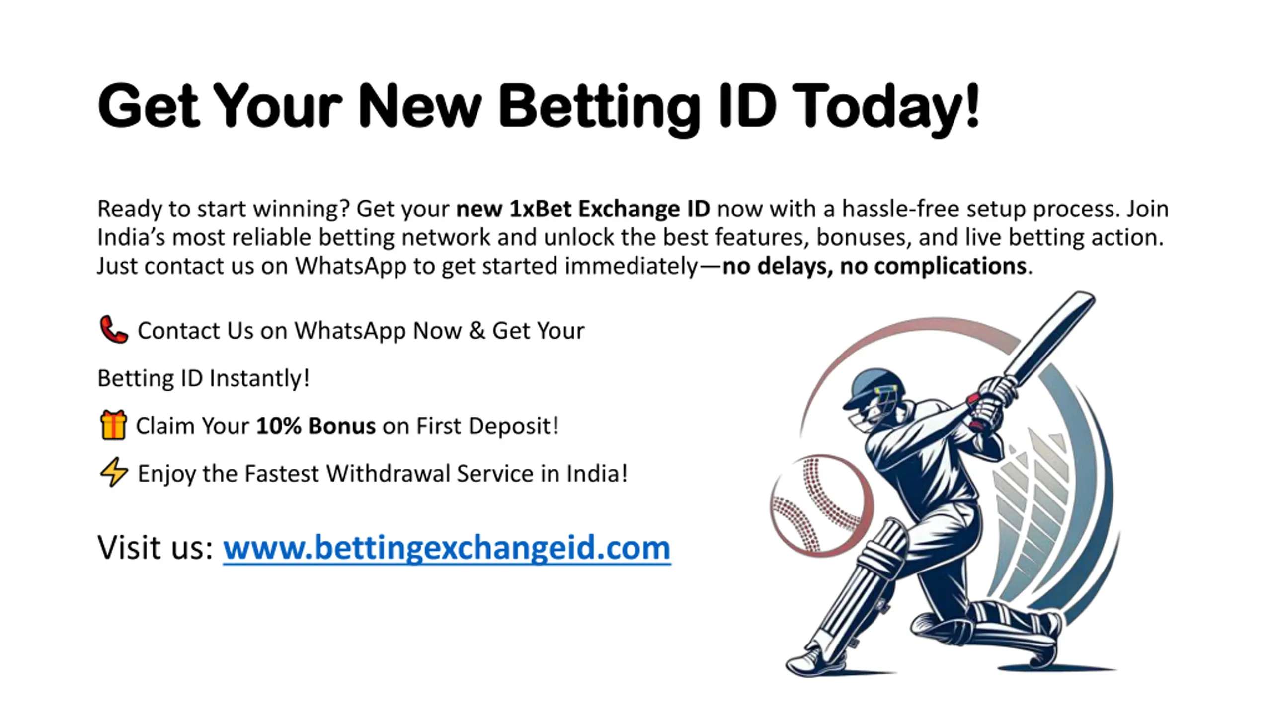 Get Your New Betting ID Today! Get Your New Betting ID Today! Ready to start winning? Get your new 1xBet Exchange ID now with a hassle-free setup process. Join India s most reliable betting network and unlock the best features, bonuses, and live betting action. Just contact us on WhatsApp to get started immediately no delays, no complications. Contact Us on WhatsApp Now & Get Your Betting ID Instantly! Claim Your 10% Bonus on First Deposit! Enjoy the Fastest Withdrawal Service in India! Visit us: www.bettingexchangeid.com