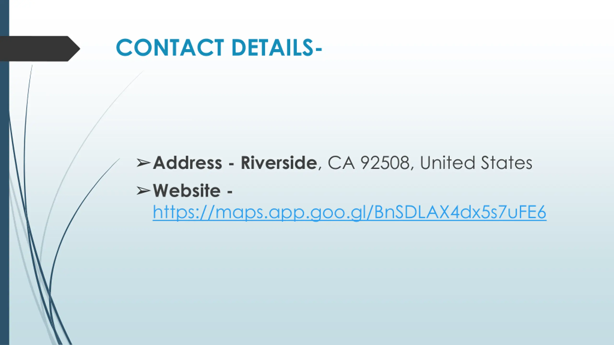 CONTACT DETAILS- Address - Riverside, CA 92508, United States Website - https://maps.app.goo.gl/BnSDLAX4dx5s7uFE6