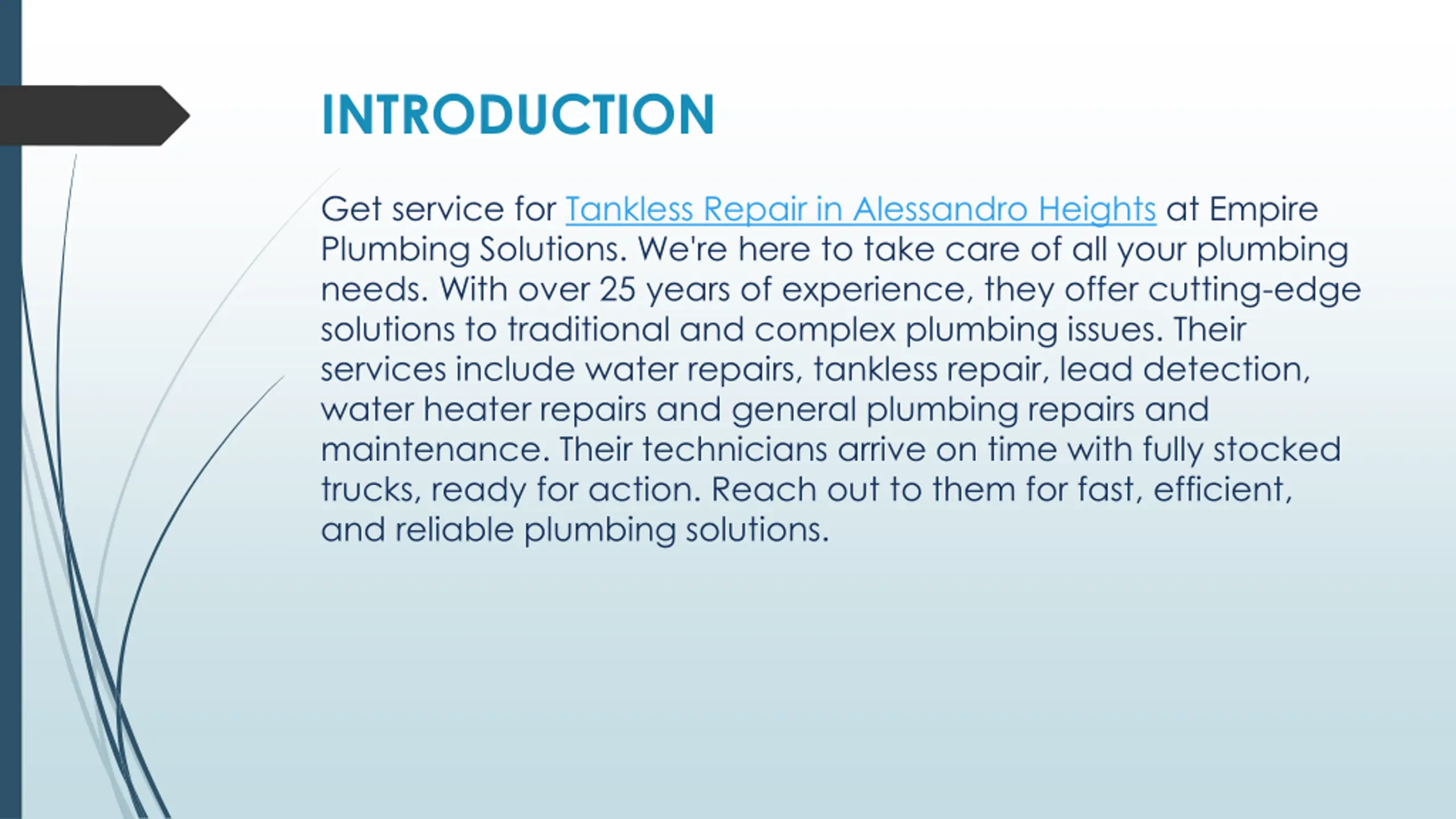 INTRODUCTION Get service for Tankless Repair in Alessandro Heights at Empire Plumbing Solutions. We're here to take care of all your plumbing needs. With over 25 years of experience, they offer cutting-edge solutions to traditional and complex plumbing issues. Their services include water repairs, tankless repair, lead detection, water heater repairs and general plumbing repairs and maintenance. Their technicians arrive on time with fully stocked trucks, ready for action. Reach out to them for fast, efficient, and reliable plumbing solutions.