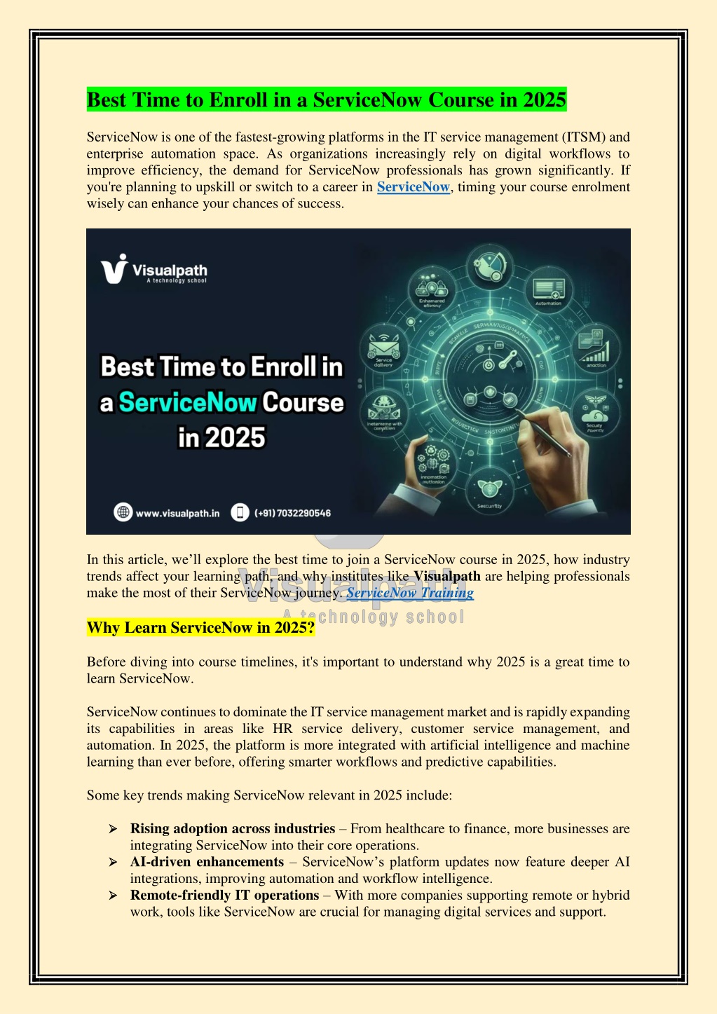 Best Time to Enroll in a ServiceNow Course in 2025 ServiceNow is one of the fastest-growing platforms in the IT service management (ITSM) and enterprise automation space. As organizations increasingly rely on digital workflows to improve efficiency, the demand for ServiceNow professionals has grown significantly. If you're planning to upskill or switch to a career in ServiceNow, timing your course enrolment wisely can enhance your chances of success. In this article, we ll explore the best time to join a ServiceNow course in 2025, how industry trends affect your learning path, and why institutes like Visualpath are helping professionals make the most of their ServiceNow journey.ServiceNow Training Why Learn ServiceNow in 2025? Before diving into course timelines, it's important to understand why 2025 is a great time to learn ServiceNow. ServiceNow continues to dominate the IT service management market and is rapidly expanding its capabilities in areas like HR service delivery, customer service management, and automation. In 2025, the platform is more integrated with artificial intelligence and machine learning than ever before, offering smarter workflows and predictive capabilities. Some key trends making ServiceNow relevant in 2025 include: Rising adoption across industries From healthcare to finance, more businesses are integrating ServiceNow into their core operations. AI-driven enhancements ServiceNow s platform updates now feature deeper AI integrations, improving automation and workflow intelligence. Remote-friendly IT operations With more companies supporting remote or hybrid work, tools like ServiceNow are crucial for managing digital services and support.