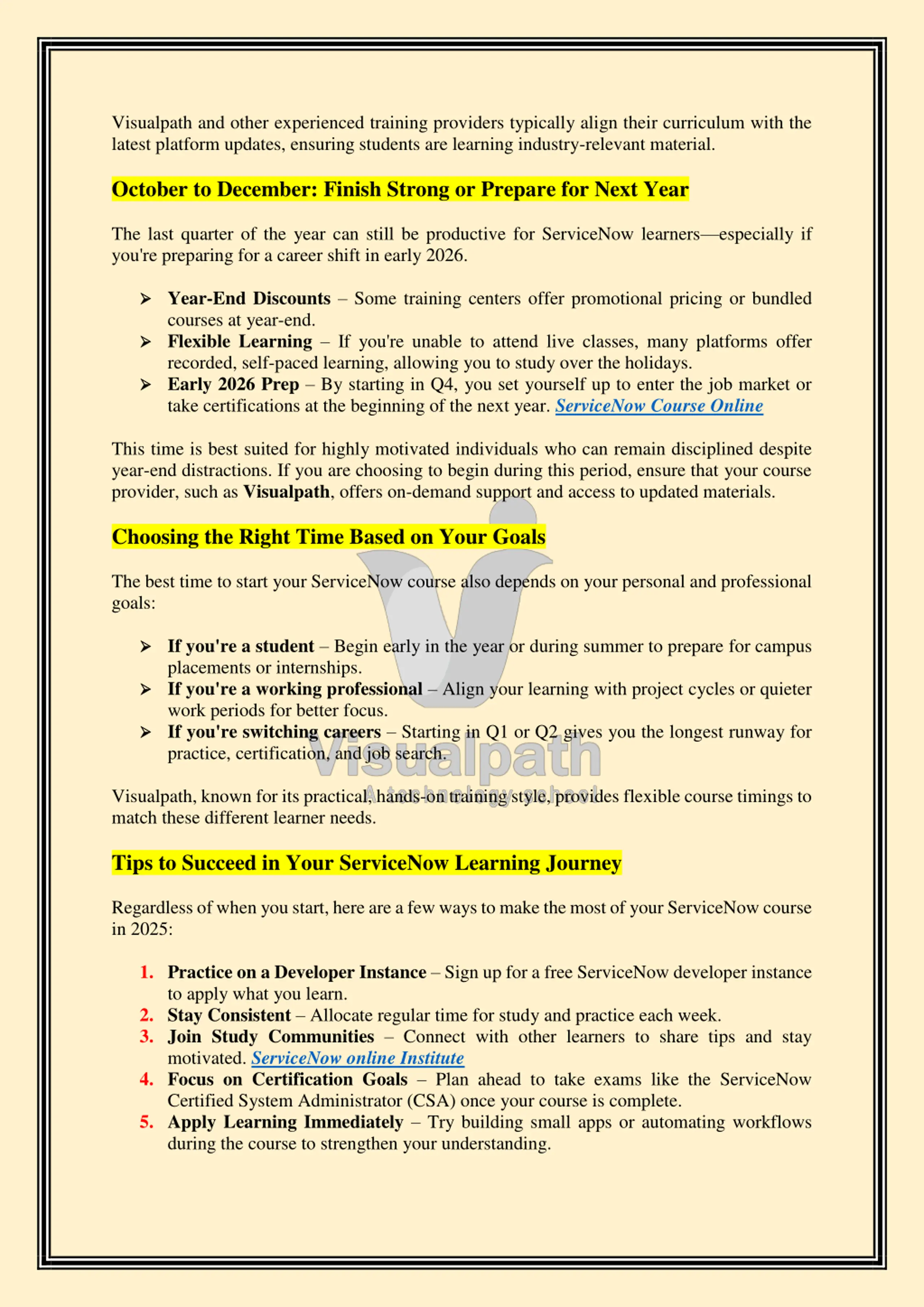 Visualpath and other experienced training providers typically align their curriculum with the latest platform updates, ensuring students are learning industry-relevant material. October to December: Finish Strong or Prepare for Next Year The last quarter of the year can still be productive for ServiceNow learners especially if you're preparing for a career shift in early 2026. Year-End Discounts Some training centers offer promotional pricing or bundled courses at year-end. Flexible Learning If you're unable to attend live classes, many platforms offer recorded, self-paced learning, allowing you to study over the holidays. Early 2026 Prep By starting in Q4, you set yourself up to enter the job market or take certifications at the beginning of the next year.ServiceNow Course Online This time is best suited for highly motivated individuals who can remain disciplined despite year-end distractions. If you are choosing to begin during this period, ensure that your course provider, such as Visualpath, offers on-demand support and access to updated materials. Choosing the Right Time Based on Your Goals The best time to start your ServiceNow course also depends on your personal and professional goals: If you're a student Begin early in the year or during summer to prepare for campus placements or internships. If you're a working professional Align your learning with project cycles or quieter work periods for better focus. If you're switching careers Starting in Q1 or Q2 gives you the longest runway for practice, certification, and job search. Visualpath, known for its practical, hands-on training style, provides flexible course timings to match these different learner needs. Tips to Succeed in Your ServiceNow Learning Journey Regardless of when you start, here are a few ways to make the most of your ServiceNow course in 2025: 1.Practice on a Developer Instance Sign up for a free ServiceNow developer instance to apply what you learn. 2.Stay Consistent Allocate regular time for study and practice each week. 3.Join Study Communities Connect with other learners to share tips and stay motivated. ServiceNow online Institute 4.Focus on Certification Goals Plan ahead to take exams like the ServiceNow Certified System Administrator (CSA) once your course is complete. 5.Apply Learning Immediately Try building small apps or automating workflows during the course to strengthen your understanding.