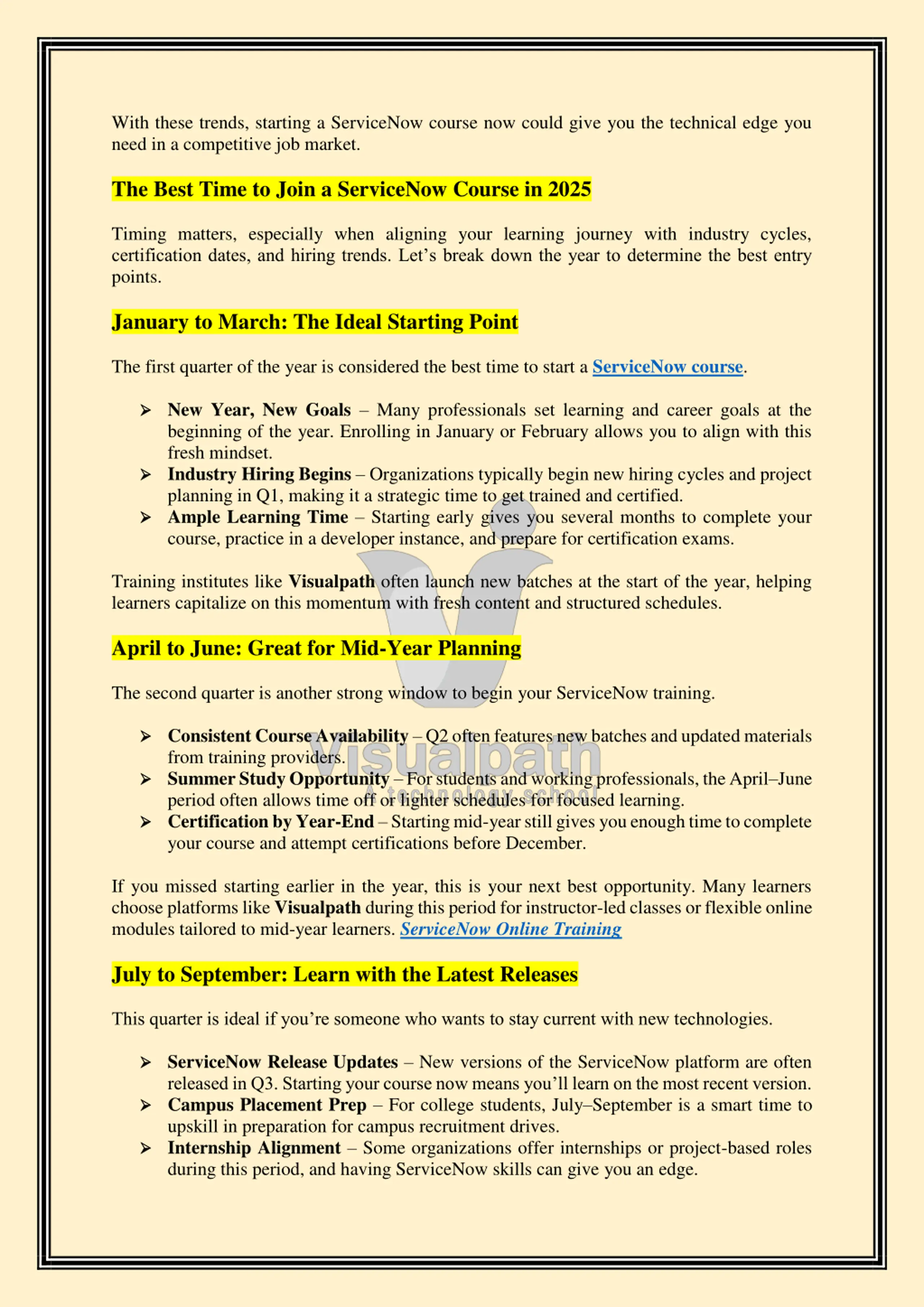 With these trends, starting a ServiceNow course now could give you the technical edge you need in a competitive job market. The Best Time to Join a ServiceNow Course in 2025 Timing matters, especially when aligning your learning journey with industry cycles, certification dates, and hiring trends. Let s break down the year to determine the best entry points. January to March: The Ideal Starting Point The first quarter of the year is considered the best time to start a ServiceNow course. New Year, New Goals Many professionals set learning and career goals at the beginning of the year. Enrolling in January or February allows you to align with this fresh mindset. Industry Hiring Begins Organizations typically begin new hiring cycles and project planning in Q1, making it a strategic time to get trained and certified. Ample Learning Time Starting early gives you several months to complete your course, practice in a developer instance, and prepare for certification exams. Training institutes like Visualpath often launch new batches at the start of the year, helping learners capitalize on this momentum with fresh content and structured schedules. April to June: Great for Mid-Year Planning The second quarter is another strong window to begin your ServiceNow training. Consistent Course Availability Q2 often features new batches and updated materials from training providers. Summer Study Opportunity For students and working professionals, the April June period often allows time off or lighter schedules for focused learning. Certification by Year-End Starting mid-year still gives you enough time to complete your course and attempt certifications before December. If you missed starting earlier in the year, this is your next best opportunity. Many learners choose platforms like Visualpath during this period for instructor-led classes or flexible online modules tailored to mid-year learners. ServiceNow Online Training July to September: Learn with the Latest Releases This quarter is ideal if you re someone who wants to stay current with new technologies. ServiceNow Release Updates New versions of the ServiceNow platform are often released in Q3. Starting your course now means you ll learn on the most recent version. Campus Placement Prep For college students, July September is a smart time to upskill in preparation for campus recruitment drives. Internship Alignment Some organizations offer internships or project-based roles during this period, and having ServiceNow skills can give you an edge.