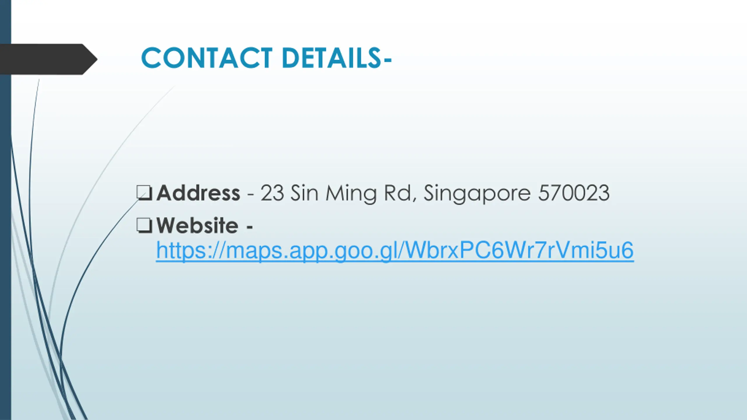 CONTACT DETAILS- Address - 23 Sin Ming Rd, Singapore 570023 Website - https://maps.app.goo.gl/WbrxPC6Wr7rVmi5u6