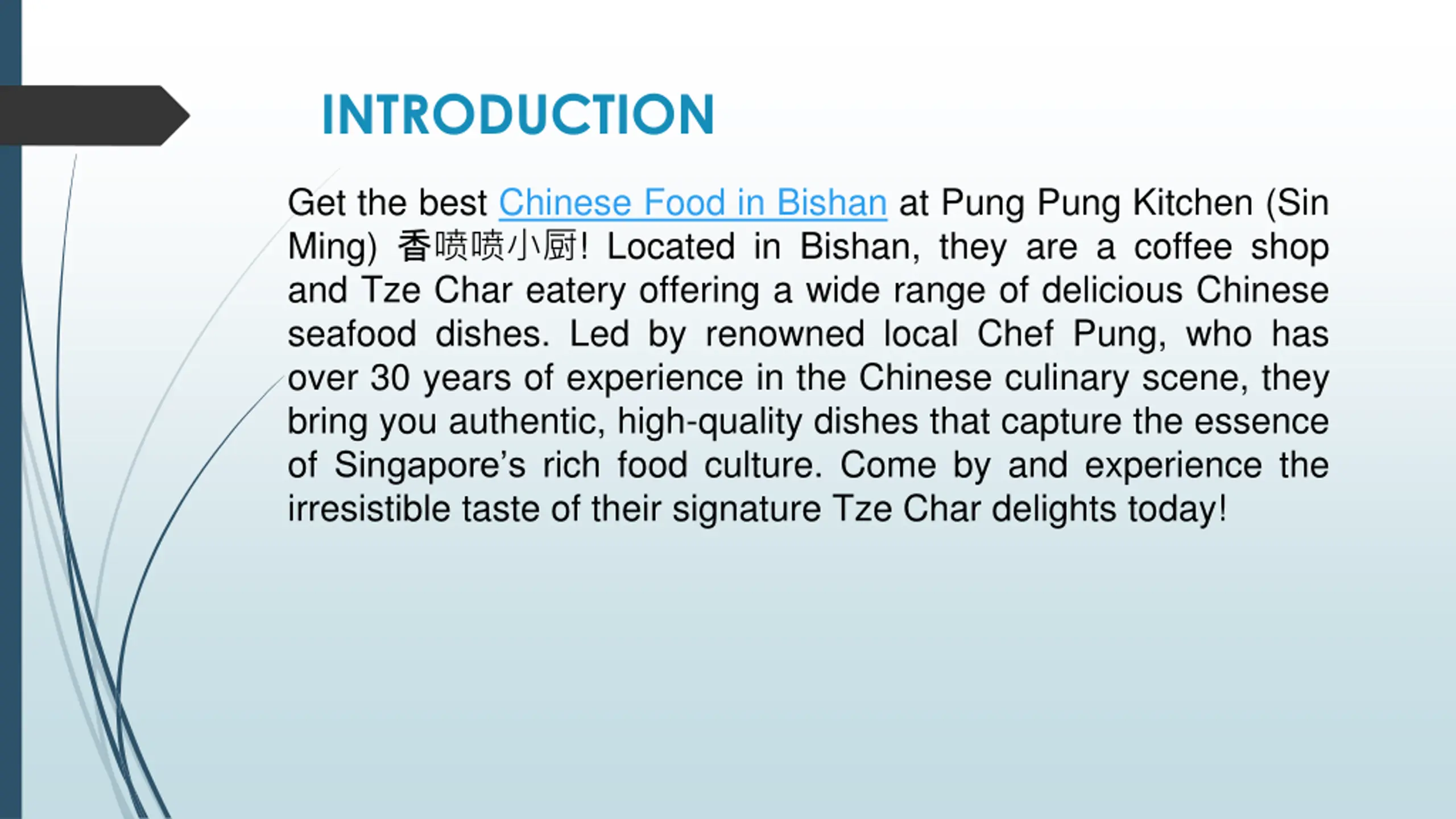 INTRODUCTION Get the best Chinese Food in Bishan at Pung Pung Kitchen (Sin Ming) ! Located in Bishan, they are a coffee shop and Tze Char eatery offering a wide range of delicious Chinese seafood dishes. Led by renowned local Chef Pung, who has over 30 years of experience in the Chinese culinary scene, they bring you authentic, high-quality dishes that capture the essence of Singapore s rich food culture. Come by and experience the irresistible taste of their signature Tze Char delights today!