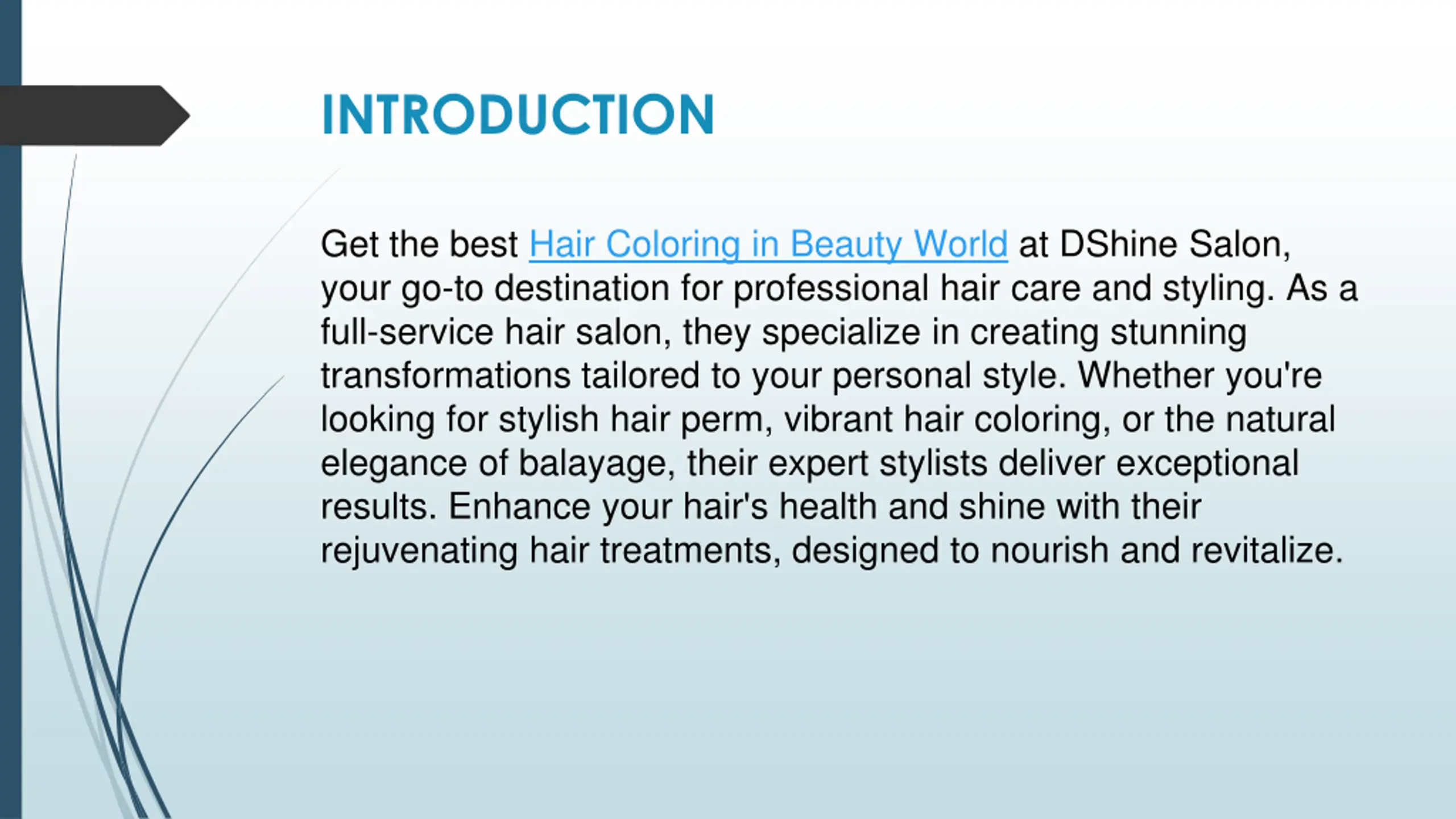 INTRODUCTION Get the best Hair Coloring in Beauty World at DShine Salon, your go-to destination for professional hair care and styling. As a full-service hair salon, they specialize in creating stunning transformations tailored to your personal style. Whether you're looking for stylish hair perm, vibrant hair coloring, or the natural elegance of balayage, their expert stylists deliver exceptional results. Enhance your hair's health and shine with their rejuvenating hair treatments, designed to nourish and revitalize.