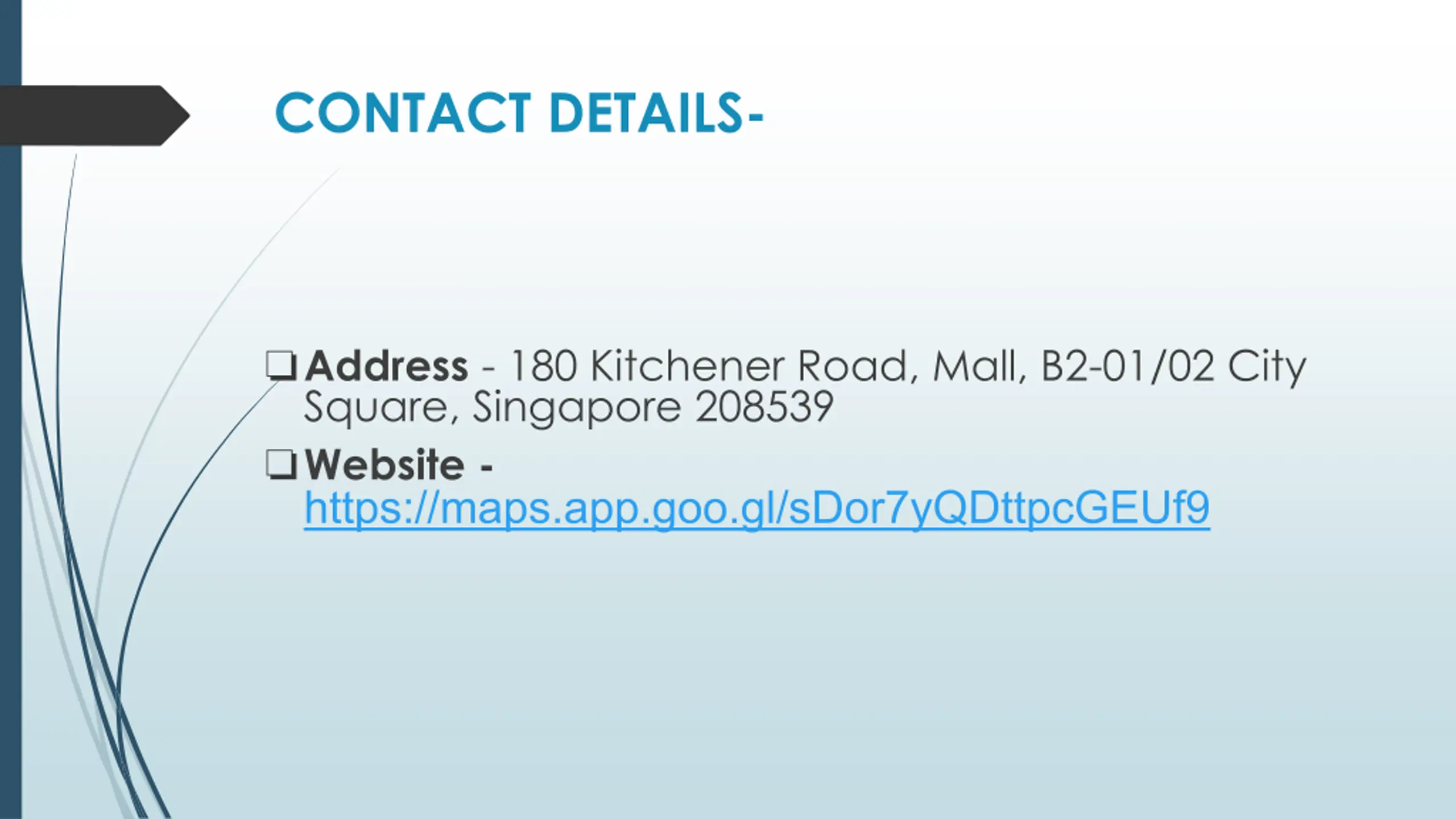 CONTACT DETAILS- Address - 180 Kitchener Road, Mall, B2-01/02 City Square, Singapore 208539 Website - https://maps.app.goo.gl/sDor7yQDttpcGEUf9