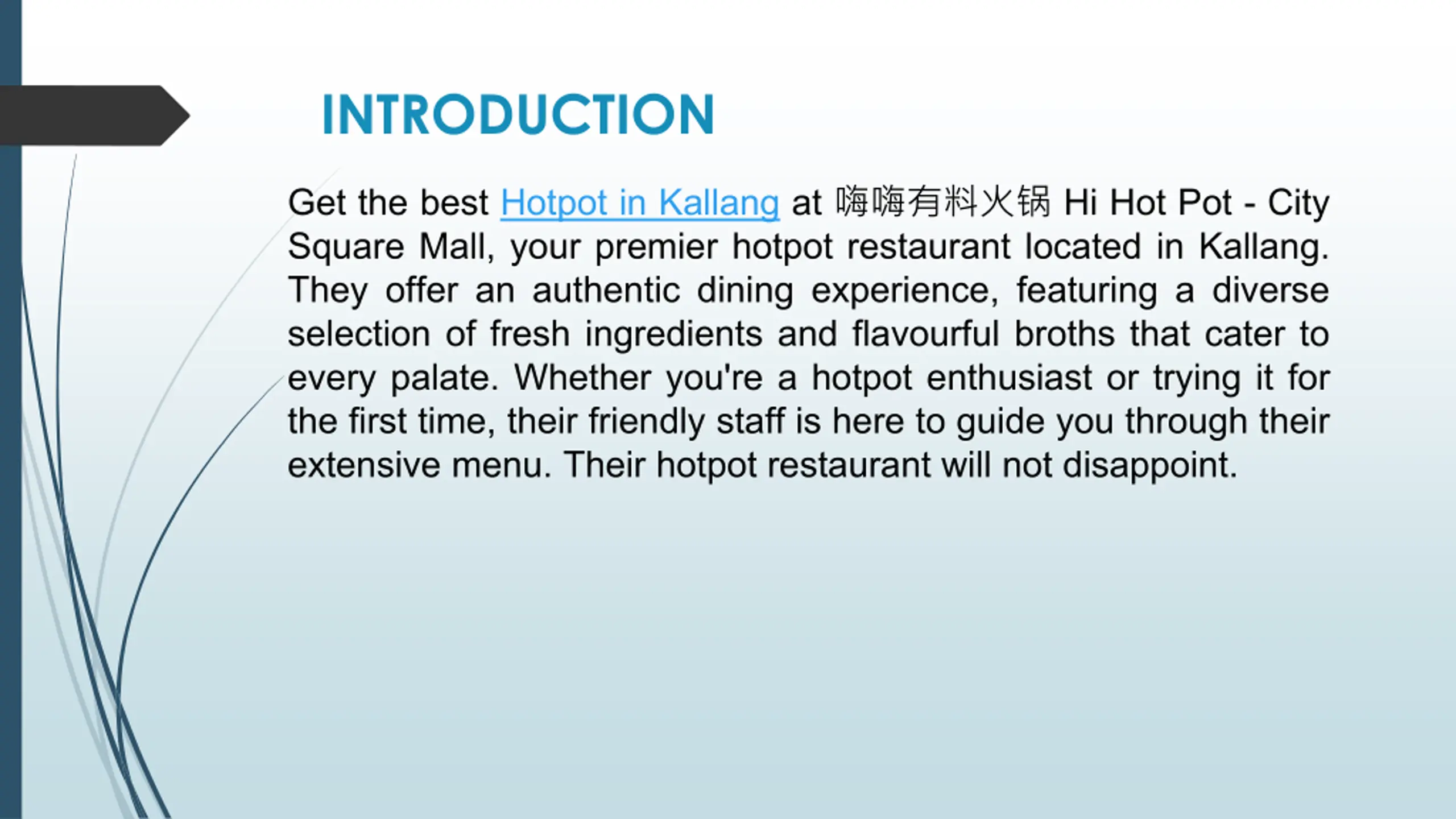 INTRODUCTION Get the best Hotpot in Kallang at Hi Hot Pot - City Square Mall, your premier hotpot restaurant located in Kallang. They offer an authentic dining experience, featuring a diverse selection of fresh ingredients and flavourful broths that cater to every palate. Whether you're a hotpot enthusiast or trying it for the first time, their friendly staff is here to guide you through their extensive menu. Their hotpot restaurant will not disappoint.