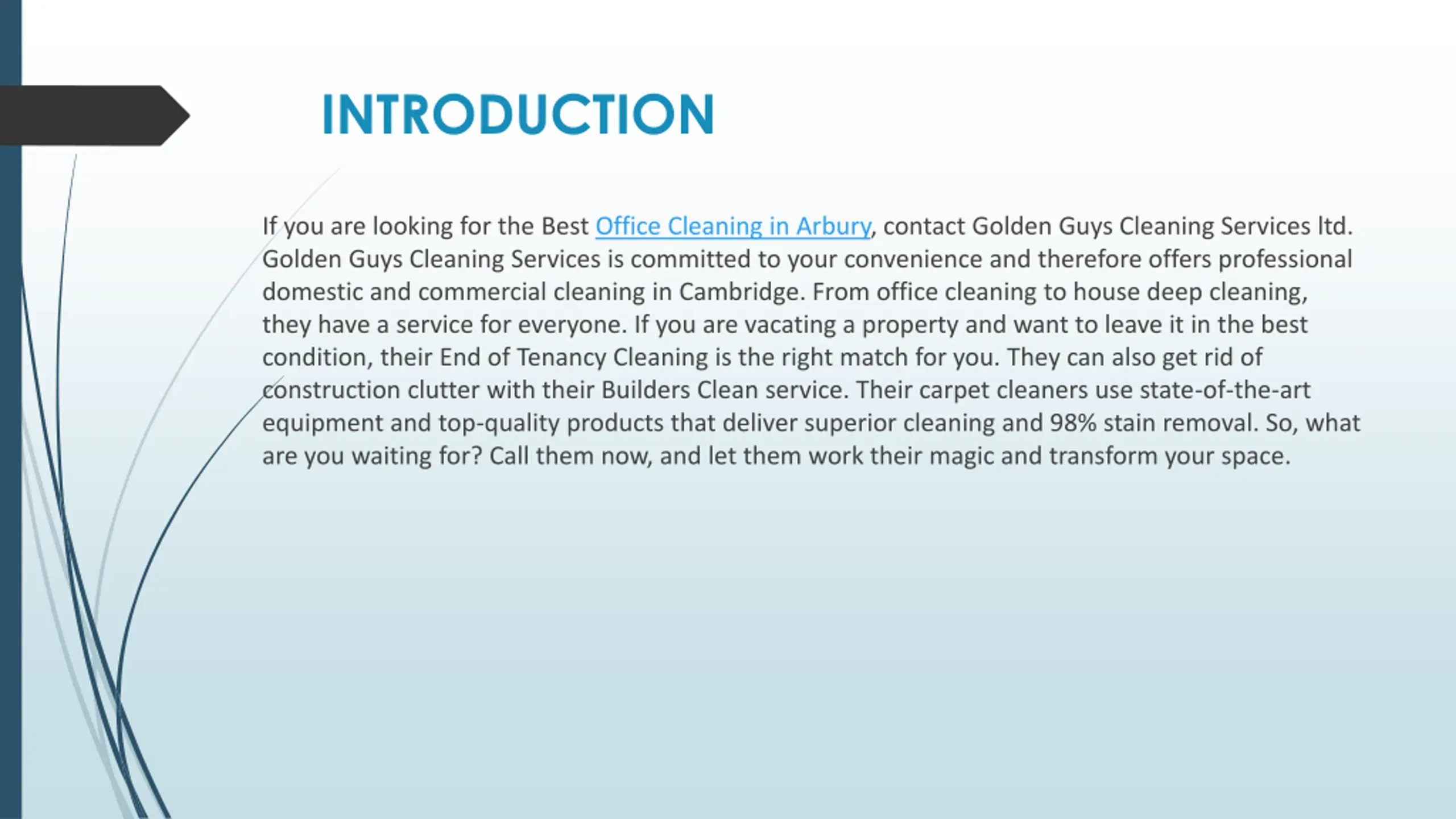 INTRODUCTION If you are looking for the Best Office Cleaning in Arbury, contact Golden Guys Cleaning Services ltd. Golden Guys Cleaning Services is committed to your convenience and therefore offers professional domestic and commercial cleaning in Cambridge. From office cleaning to house deep cleaning, they have a service for everyone. If you are vacating a property and want to leave it in the best condition, their End of Tenancy Cleaning is the right match for you. They can also get rid of construction clutter with their Builders Clean service. Their carpet cleaners use state-of-the-art equipment and top-quality products that deliver superior cleaning and 98% stain removal. So, what are you waiting for? Call them now, and let them work their magic and transform your space.