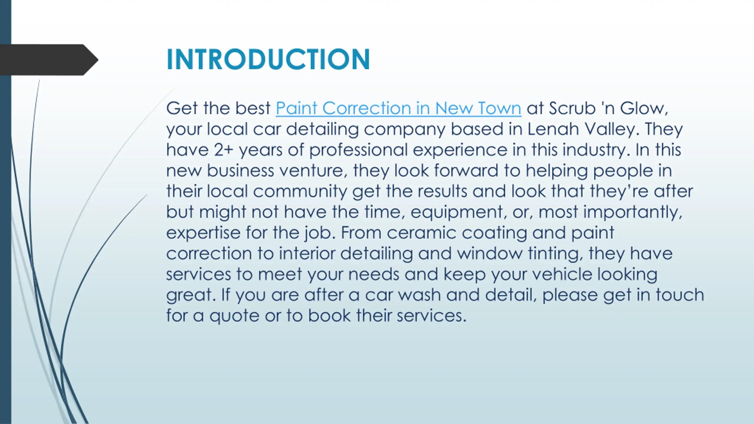 INTRODUCTION Get the best Paint Correction in New Town at Scrub 'n Glow, your local car detailing company based in Lenah Valley. They have 2+ years of professional experience in this industry. In this new business venture, they look forward to helping people in their local community get the results and look that they re after but might not have the time, equipment, or, most importantly, expertise for the job. From ceramic coating and paint correction to interior detailing and window tinting, they have services to meet your needs and keep your vehicle looking great. If you are after a car wash and detail, please get in touch for a quote or to book their services.