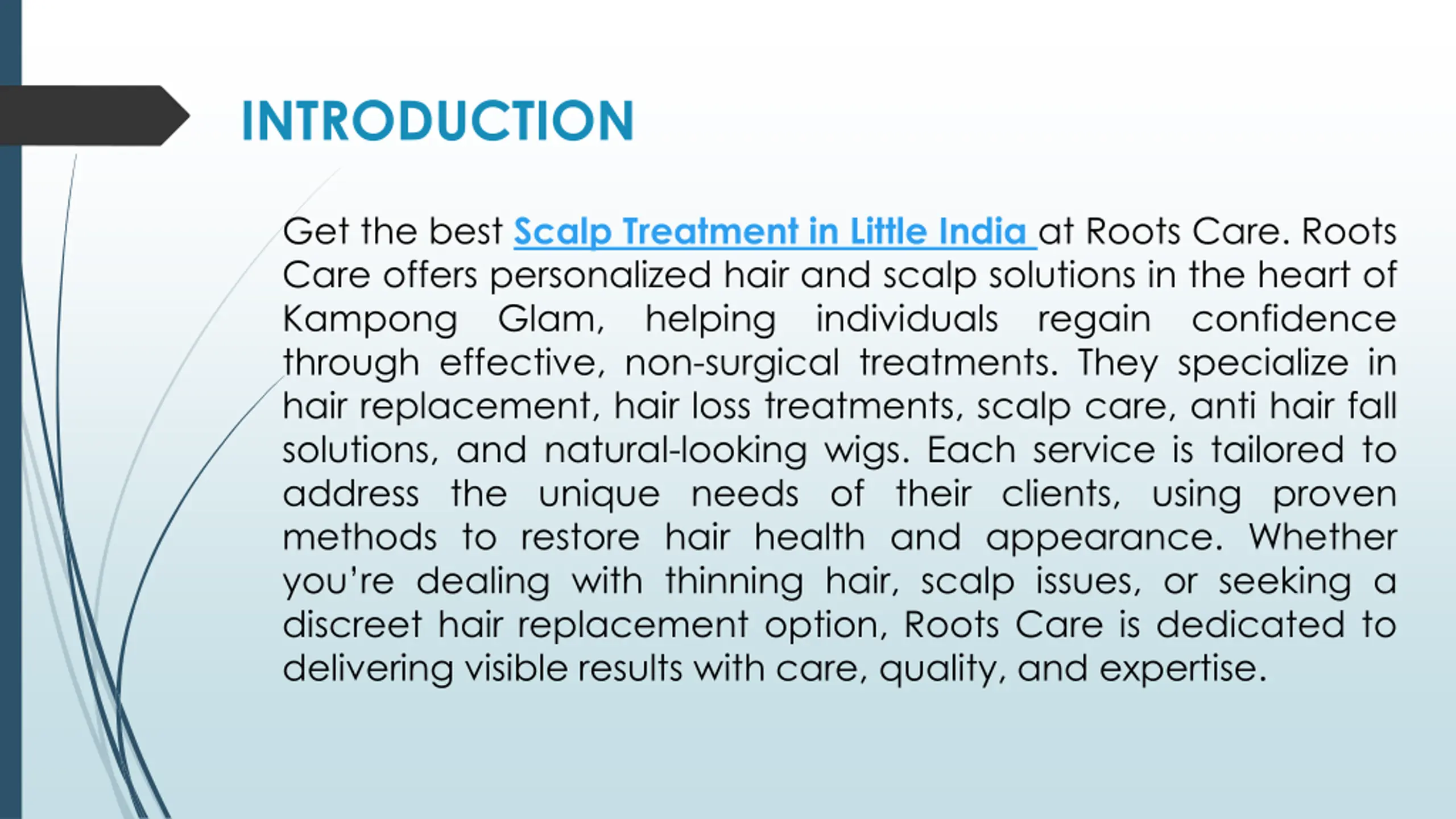 INTRODUCTION Get the best Scalp Treatment in Little India at Roots Care. Roots Care offers personalized hair and scalp solutions in the heart of Kampong Glam, helping individuals regain confidence through effective, non-surgical treatments. They specialize in hair replacement, hair loss treatments, scalp care, anti hair fall solutions, and natural-looking wigs. Each service is tailored to address the unique needs of their clients, using proven methods to restore hair health and appearance. Whether you re dealing with thinning hair, scalp issues, or seeking a discreet hair replacement option, Roots Care is dedicated to delivering visible results with care, quality, and expertise.