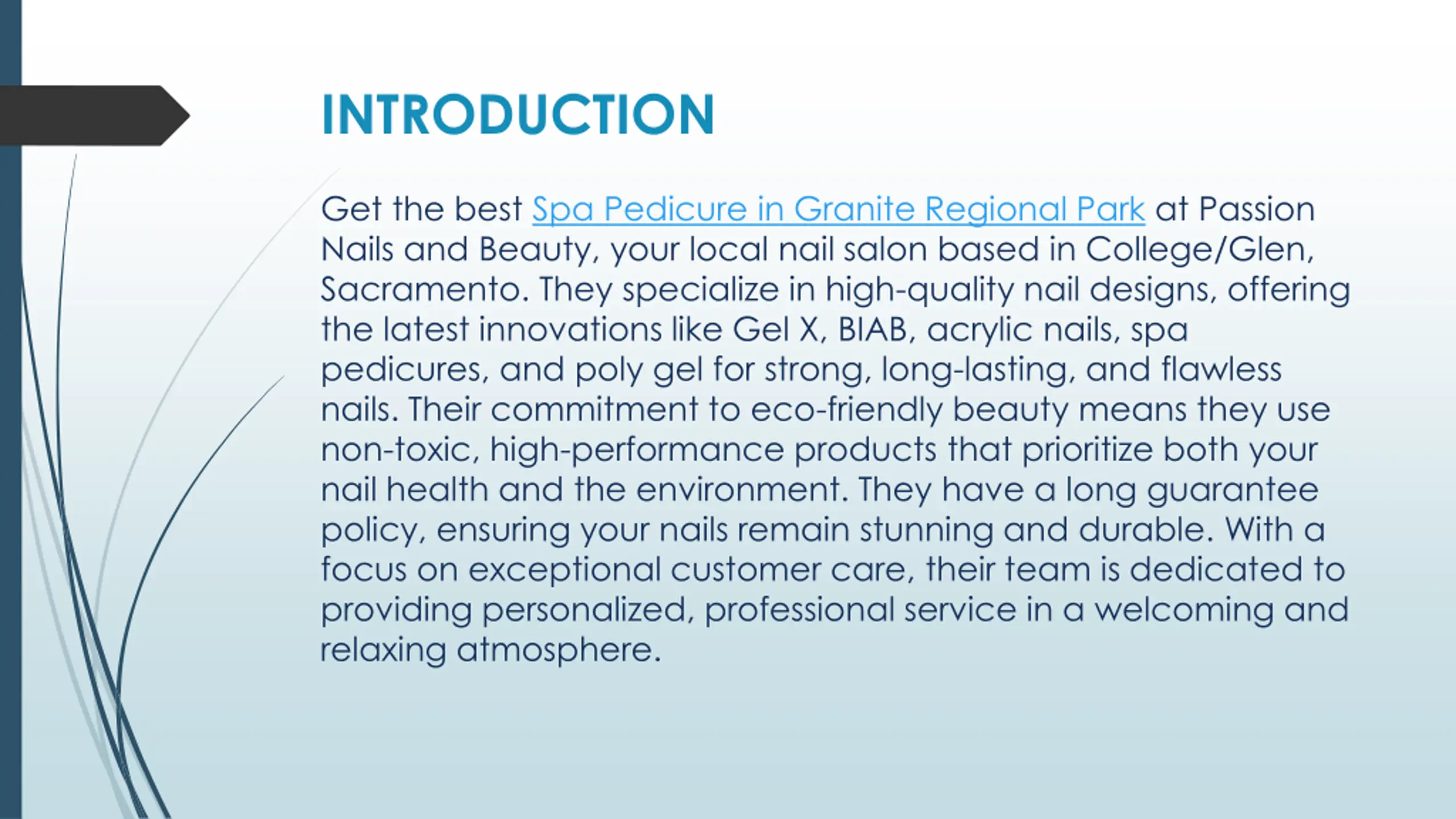 INTRODUCTION Get the best Spa Pedicure in Granite Regional Park at Passion Nails and Beauty, your local nail salon based in College/Glen, Sacramento. They specialize in high-quality nail designs, offering the latest innovations like Gel X, BIAB, acrylic nails, spa pedicures, and poly gel for strong, long-lasting, and flawless nails. Their commitment to eco-friendly beauty means they use non-toxic, high-performance products that prioritize both your nail health and the environment. They have a long guarantee policy, ensuring your nails remain stunning and durable. With a focus on exceptional customer care, their team is dedicated to providing personalized, professional service in a welcoming and relaxing atmosphere.