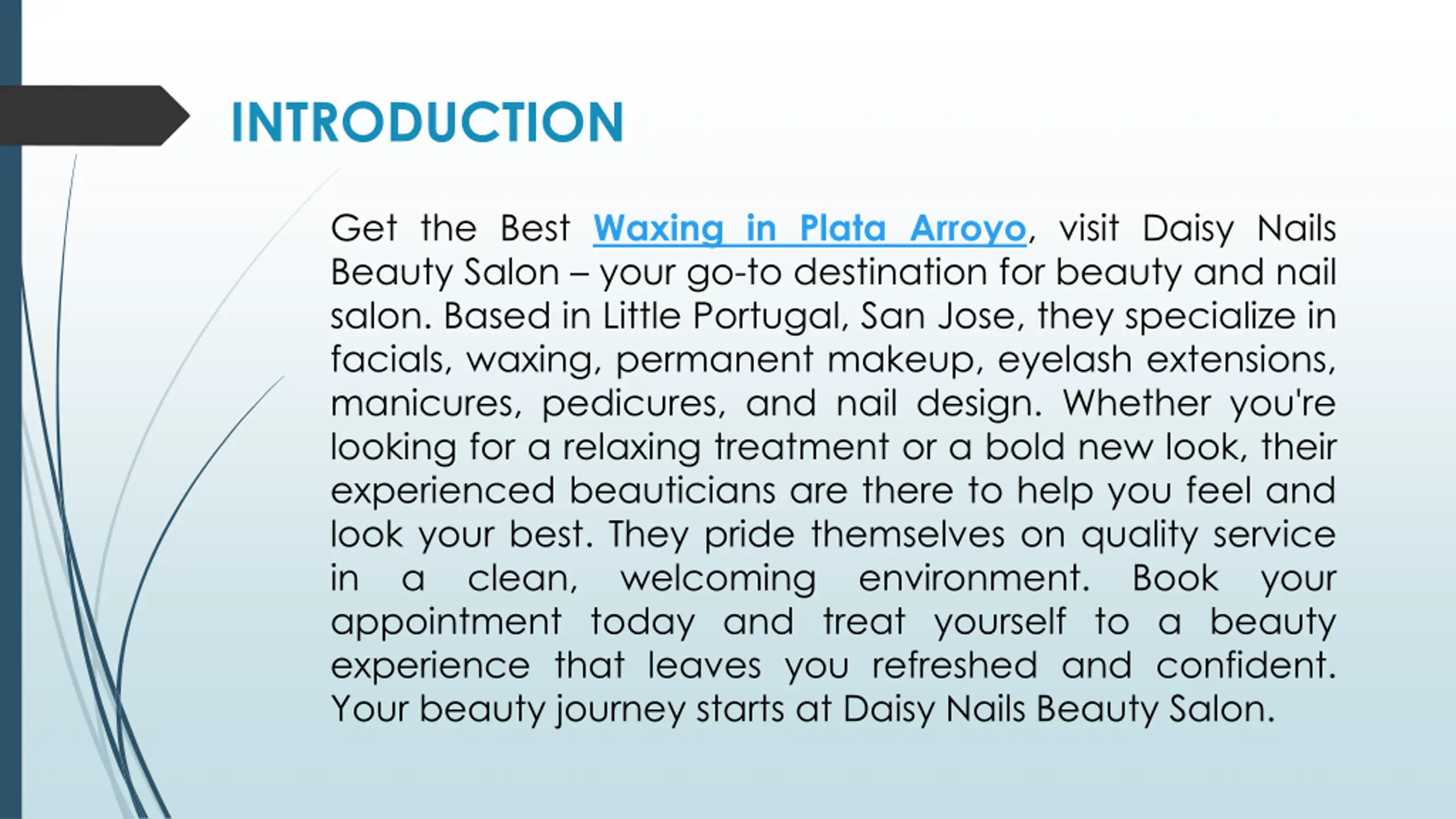 INTRODUCTION Get the Best Waxing in Plata Arroyo, visit Daisy Nails Beauty Salon your go-to destination for beauty and nail salon. Based in Little Portugal, San Jose, they specialize in facials, waxing, permanent makeup, eyelash extensions, manicures, pedicures, and nail design. Whether you're looking for a relaxing treatment or a bold new look, their experienced beauticians are there to help you feel and look your best. They pride themselves on quality service in a clean, welcoming environment. Book your appointment today and treat yourself to a beauty experience that leaves you refreshed and confident. Your beauty journey starts at Daisy Nails Beauty Salon. Get the Best Waxing in Plata Arroyo, visit Daisy Nails Beauty Salon your go-to destination for beauty and nail salon. Based in Little Portugal, San Jose, they specialize in facials, waxing, permanent makeup, eyelash extensions, manicures, pedicures, and nail design. Whether you're looking for a relaxing treatment or a bold new look, their experienced beauticians are there to help you feel and look your best. They pride themselves on quality service in a clean, welcoming environment. Book your appointment today and treat yourself to a beauty experience that leaves you refreshed and confident. Your beauty journey starts at Daisy Nails Beauty Salon.