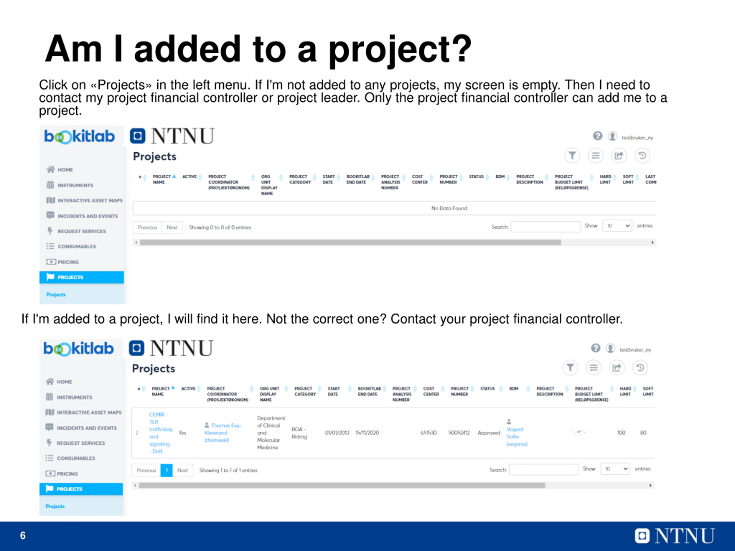 Am I added to a project? Click on Projects in the left menu. If I'm not added to any projects, my screen is empty. Then I need to contact my project financial controller or project leader. Only the project financial controller can add me to a project. If I'm added to a project, I will find it here. Not the correct one? Contact your project financial controller. 6