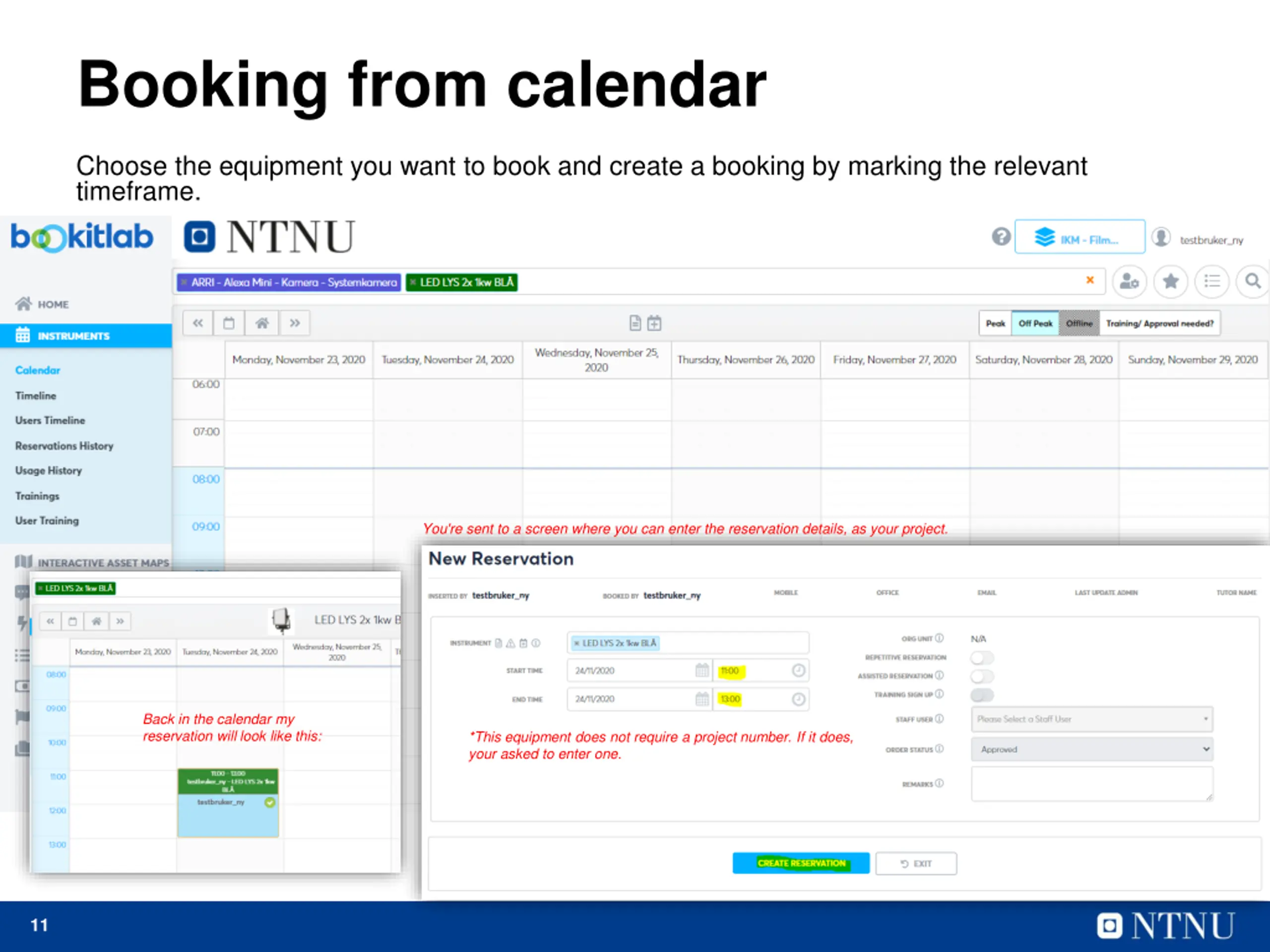 Booking from calendar Choose the equipment you want to book and create a booking by marking the relevant timeframe. You're sent to a screen where you can enter the reservation details, as your project. Back in the calendar my reservation will look like this: *This equipment does not require a project number. If it does, your asked to enter one. 11
