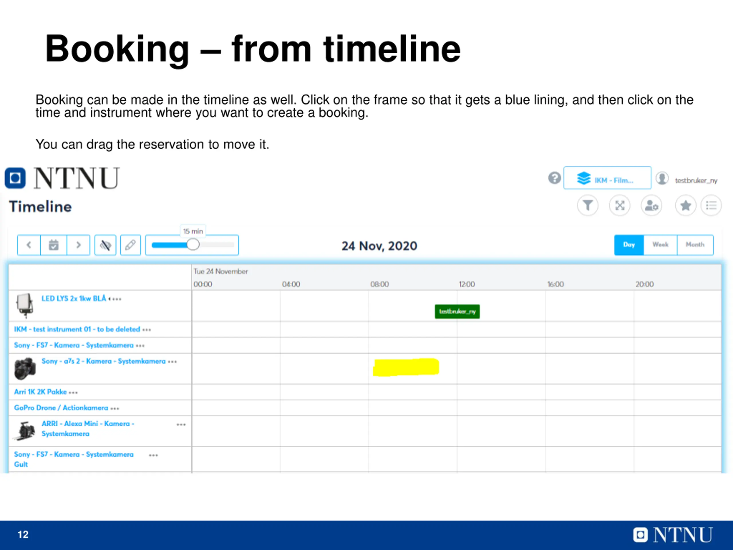 Booking from timeline Booking can be made in the timeline as well. Click on the frame so that it gets a blue lining, and then click on the time and instrument where you want to create a booking. You can drag the reservation to move it. 12