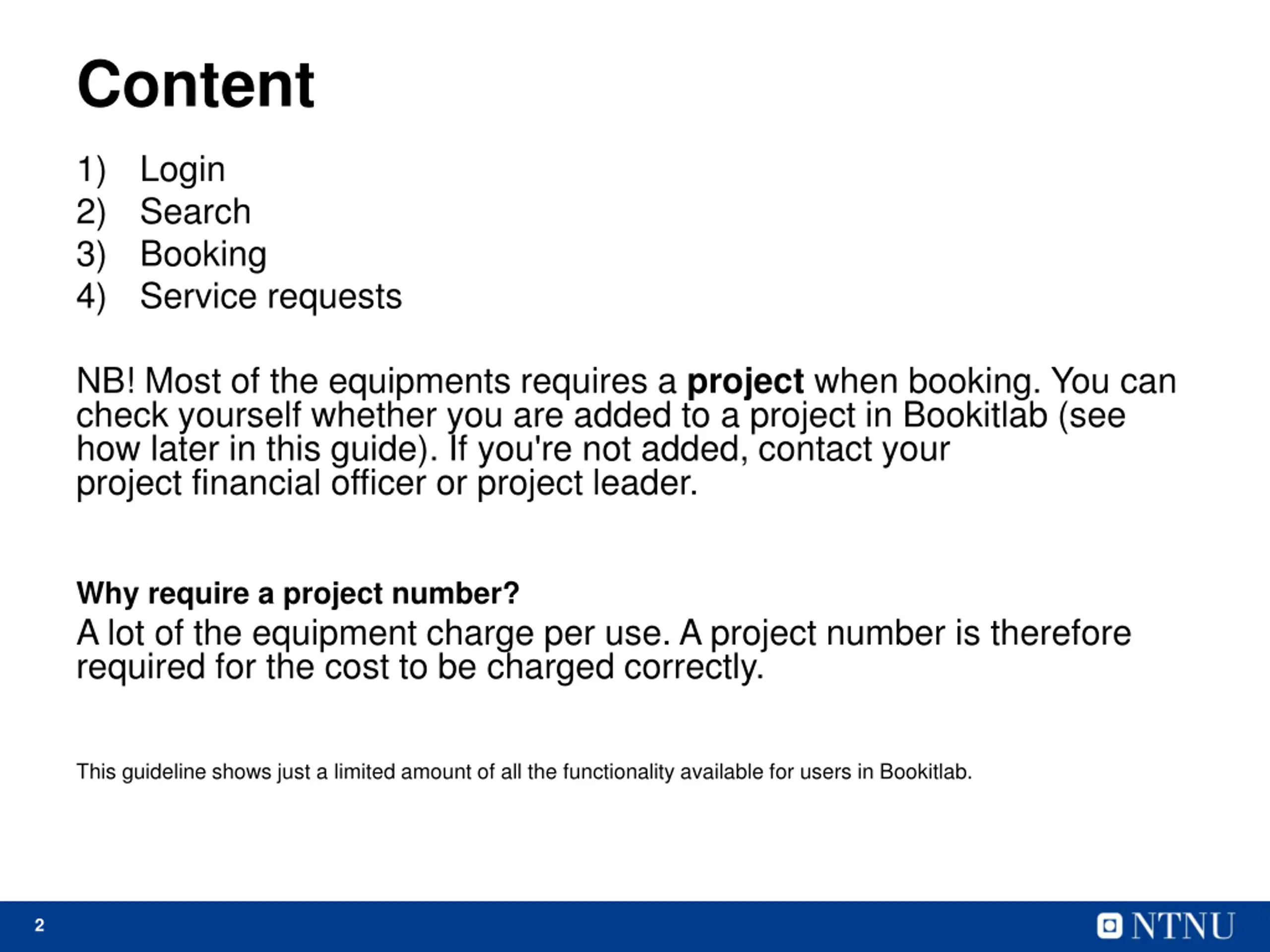 Content 1) 2) 3) 4) Login Search Booking Service requests NB! Most of the equipments requires a project when booking. You can check yourself whether you are added to a project in Bookitlab (see how later in this guide). If you're not added, contact your project financial officer or project leader. Why require a project number? A lot of the equipment charge per use. A project number is therefore required for the cost to be charged correctly. This guideline shows just a limited amount of all the functionality available for users in Bookitlab. 2