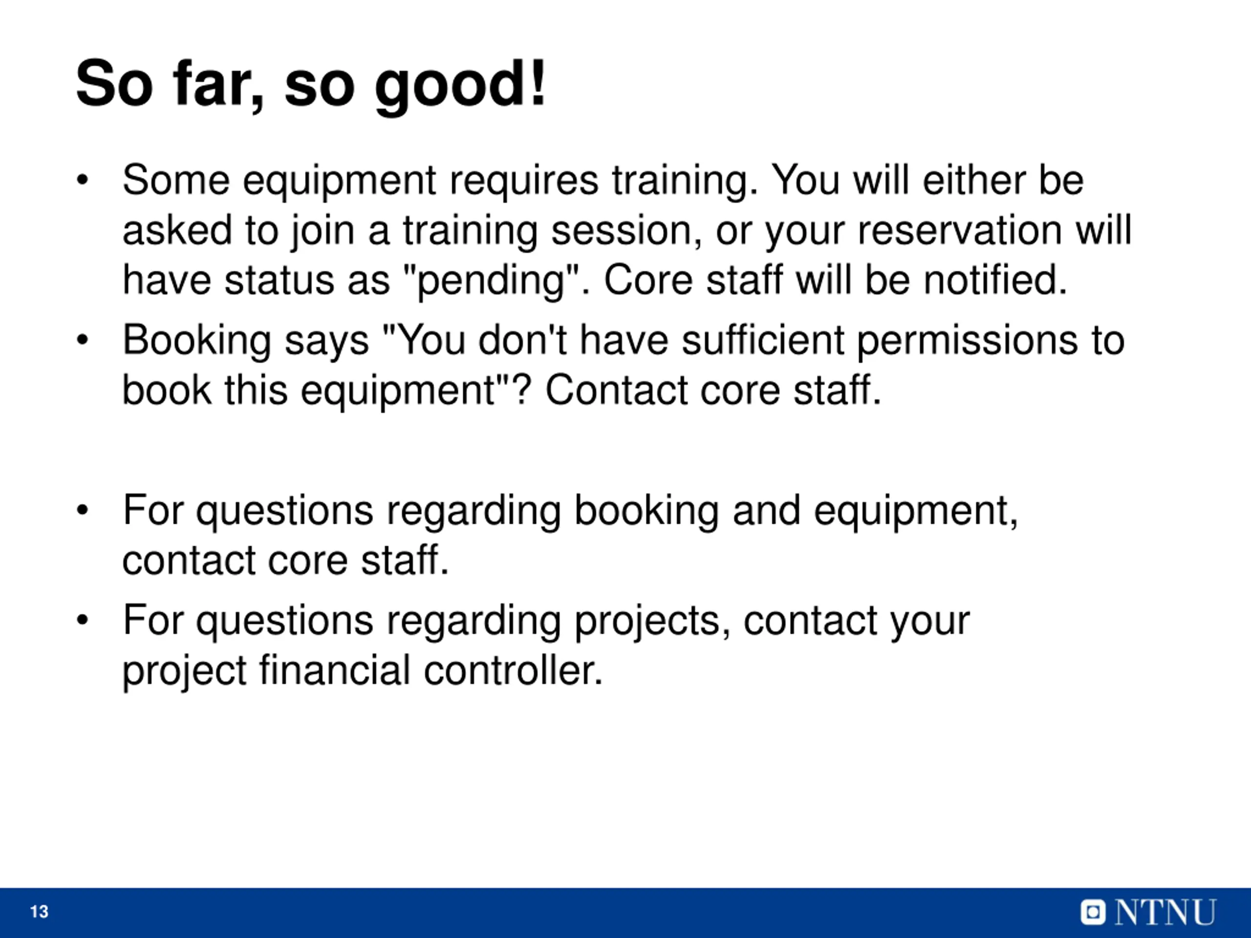 So far, so good! Some equipment requires training. You will either be asked to join a training session, or your reservation will have status as "pending". Core staff will be notified. Booking says "You don't have sufficient permissions to book this equipment"? Contact core staff. For questions regarding booking and equipment, contact core staff. For questions regarding projects, contact your project financial controller. 13