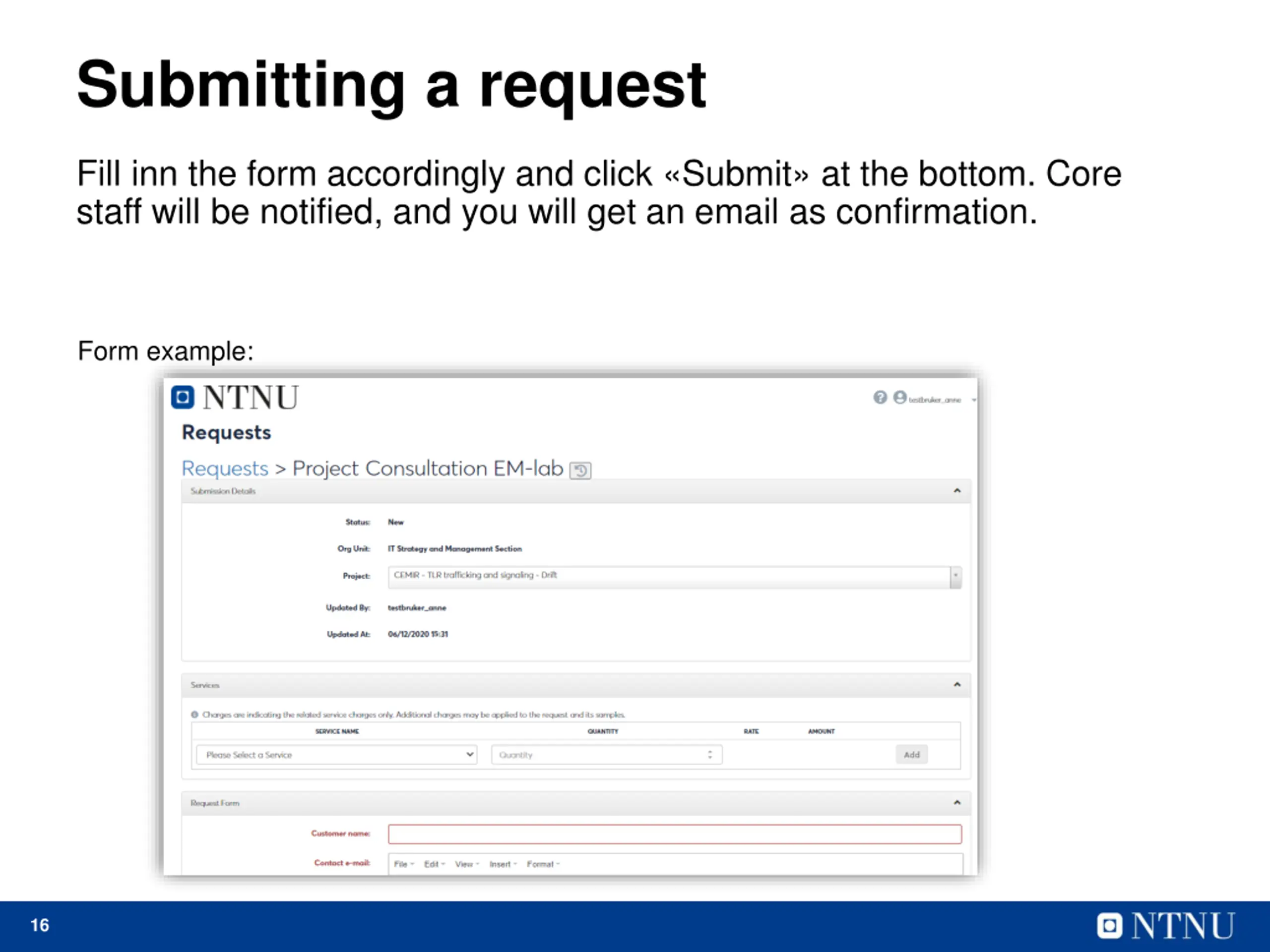 Submitting a request Fill inn the form accordingly and click Submit at the bottom. Core staff will be notified, and you will get an email as confirmation. Form example: 16