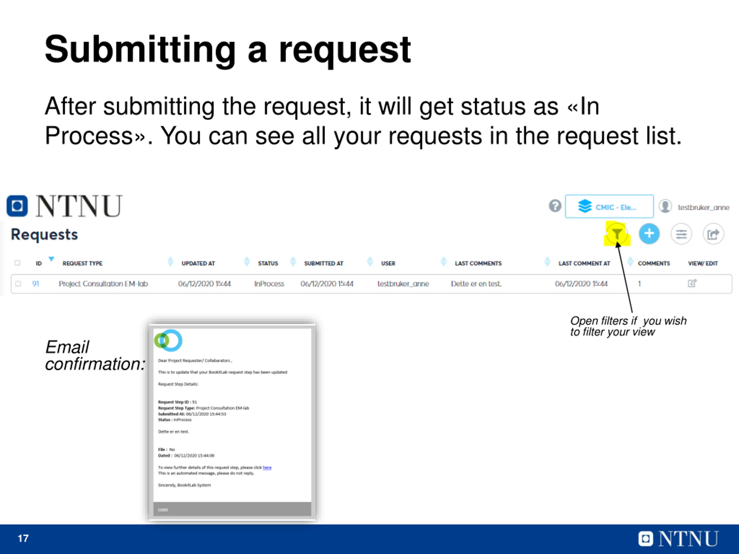 Submitting a request After submitting the request, it will get status as In Process . You can see all your requests in the request list. Open filters if you wish to filter your view Email confirmation: 17