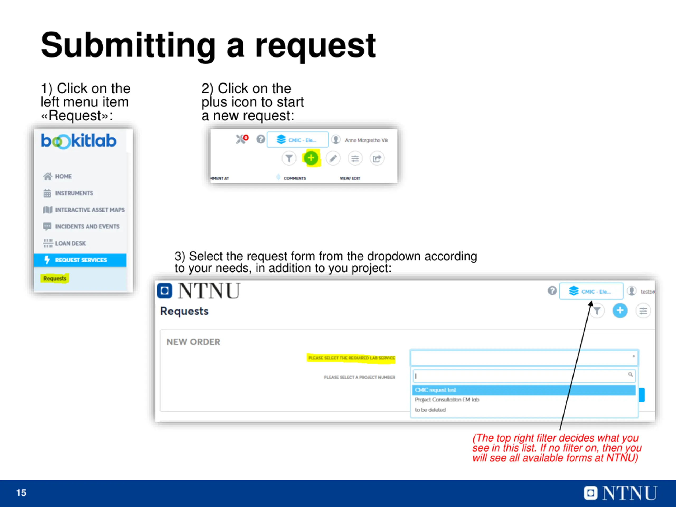 Submitting a request 1) Click on the left menu item Request : 2) Click on the plus icon to start a new request: 3) Select the request form from the dropdown according to your needs, in addition to you project: (The top right filter decides what you see in this list. If no filter on, then you will see all available forms at NTNU) 15