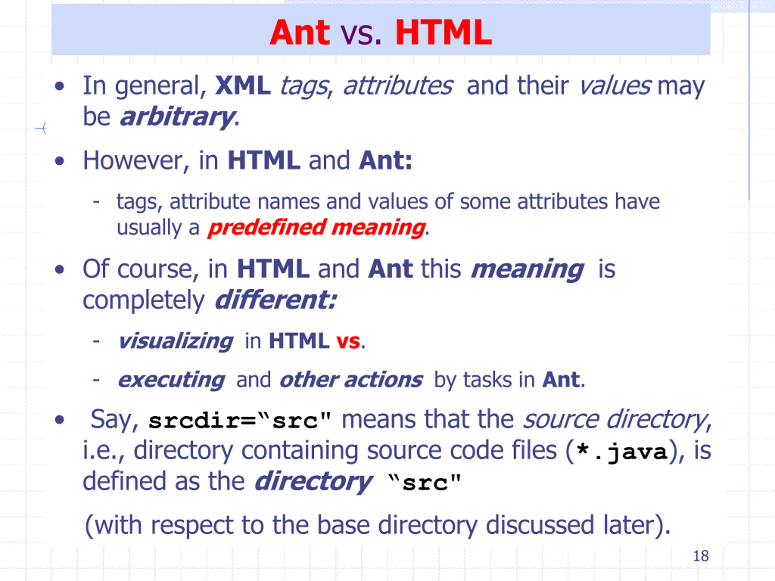 Ant vs. HTML In general, XML tags, attributes and their values may be arbitrary. However, in HTML and Ant: - tags, attribute names and values of some attributes have usually a predefined meaning. Of course, in HTML and Ant this meaning is completely different: - visualizing in HTMLvs. - executing and otheractions by tasks in Ant. Say, srcdir= src" means that the source directory, i.e., directory containing source code files (*.java), is defined as the directory src" (with respect to the base directory discussed later). 18