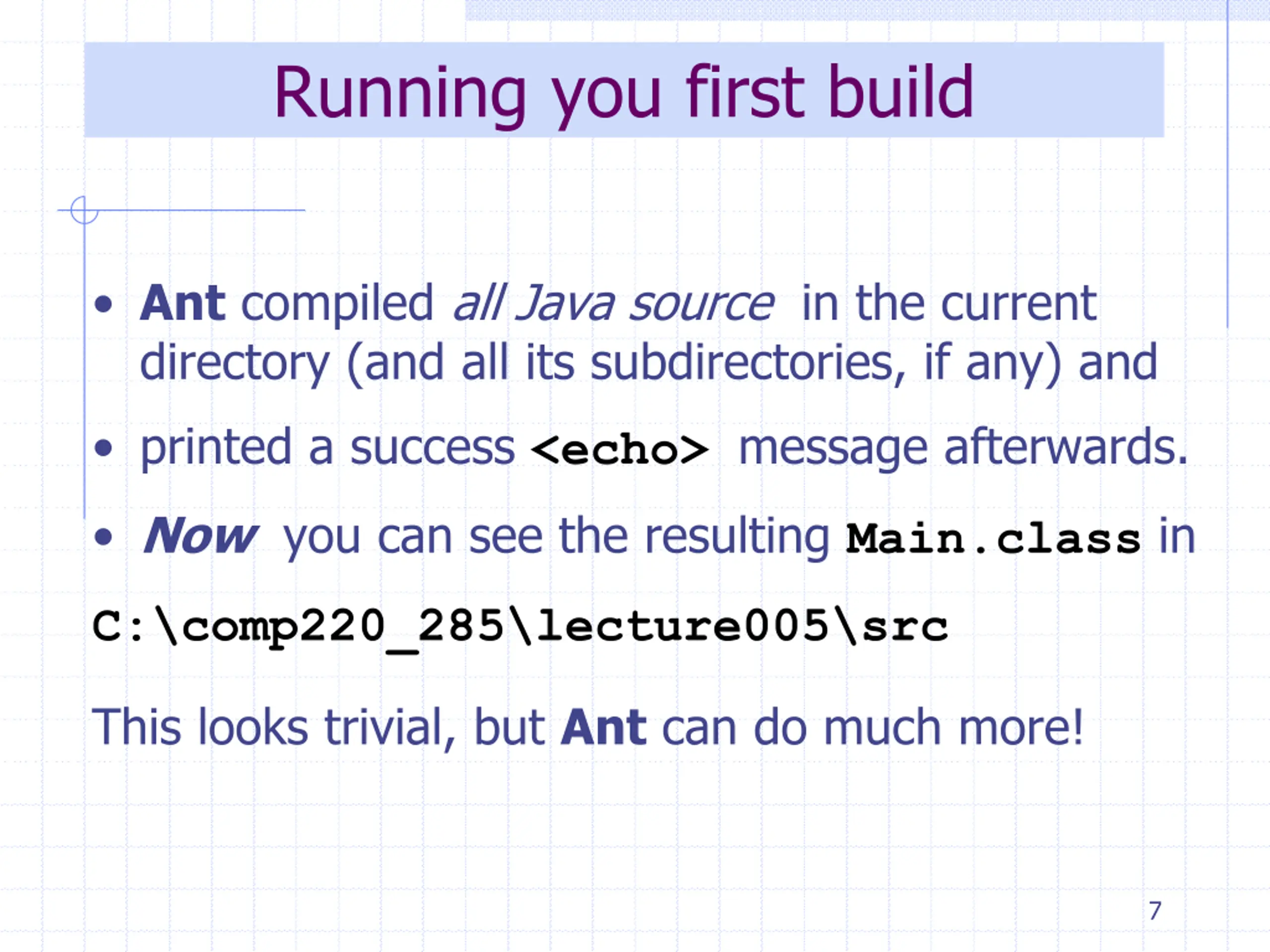 Running you first build Ant compiled all Java source in the current directory (and all its subdirectories, if any) and printed a success <echo> message afterwards. Now you can see the resulting Main.class in C:\comp220_285\lecture005\src This looks trivial, but Ant can do much more! 7