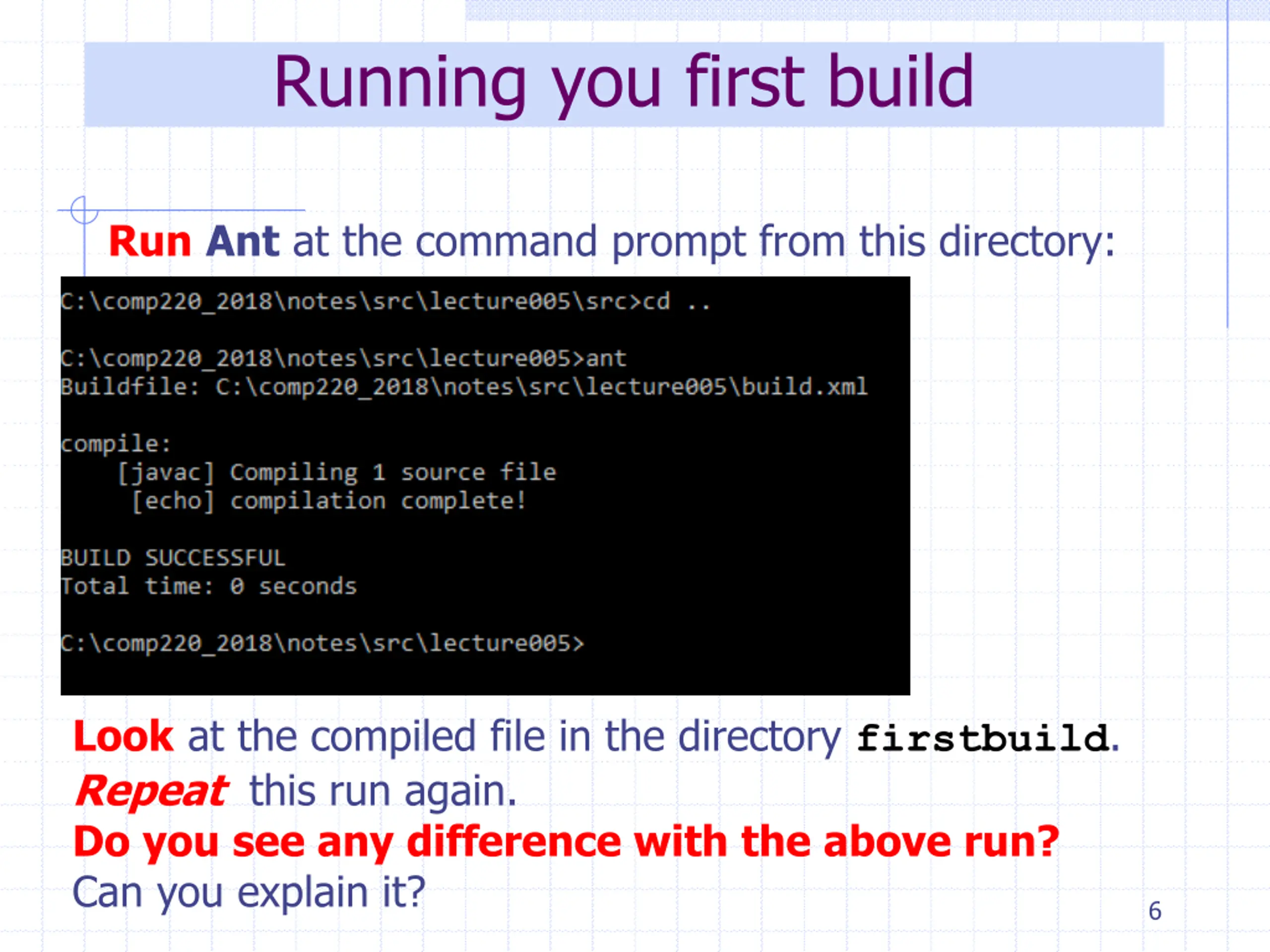 Running you first build RunAnt at the command prompt from this directory: Look at the compiled file in the directory firstbuild. Repeat this run again. Do you see any difference with the above run? Can you explain it? 6