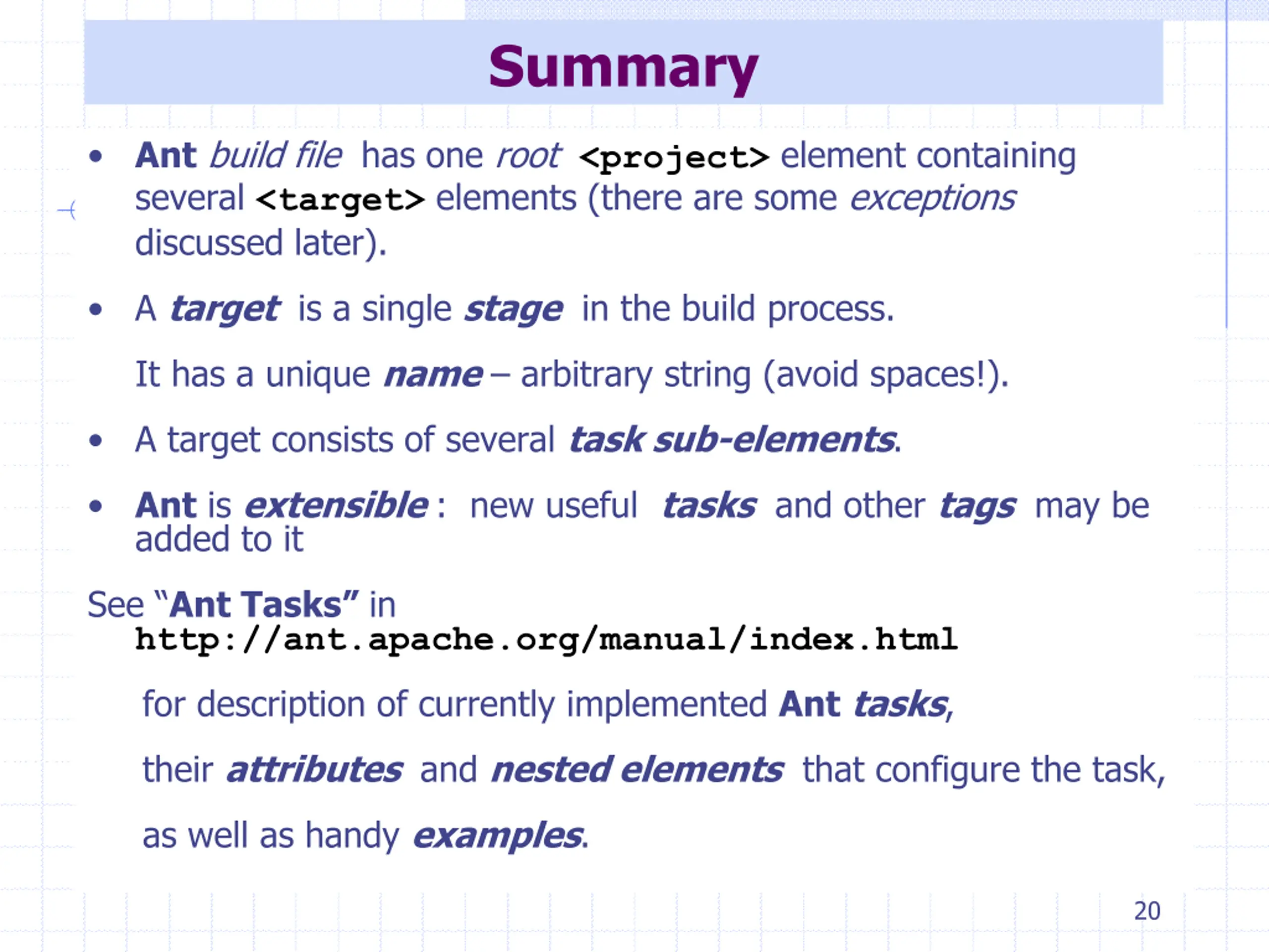 Summary Ant build file has one root <project> element containing several <target> elements (there are some exceptions discussed later). A target is a single stage in the build process. It has a unique name arbitrary string (avoid spaces!). A target consists of several task sub-elements. Ant is extensible : new useful tasks and other tags may be added to it See Ant Tasks in http://ant.apache.org/manual/index.html for description of currently implemented Anttasks, their attributes and nested elements that configure the task, as well as handy examples. 20