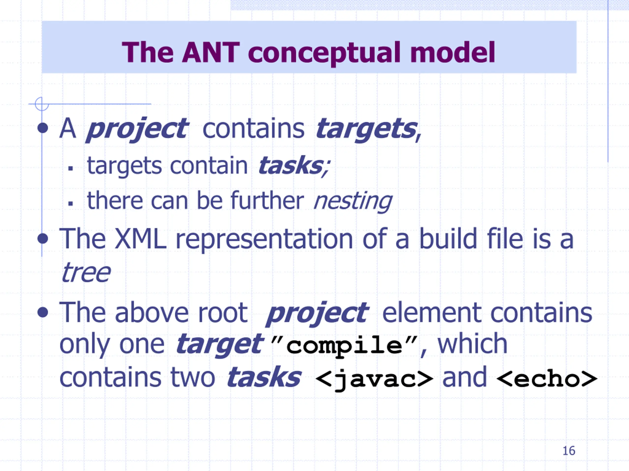 The ANT conceptual model A project contains targets, targets contain tasks; there can be further nesting The XML representation of a build file is a tree The above root project element contains only one target compile , which contains two tasks<javac> and <echo> 16