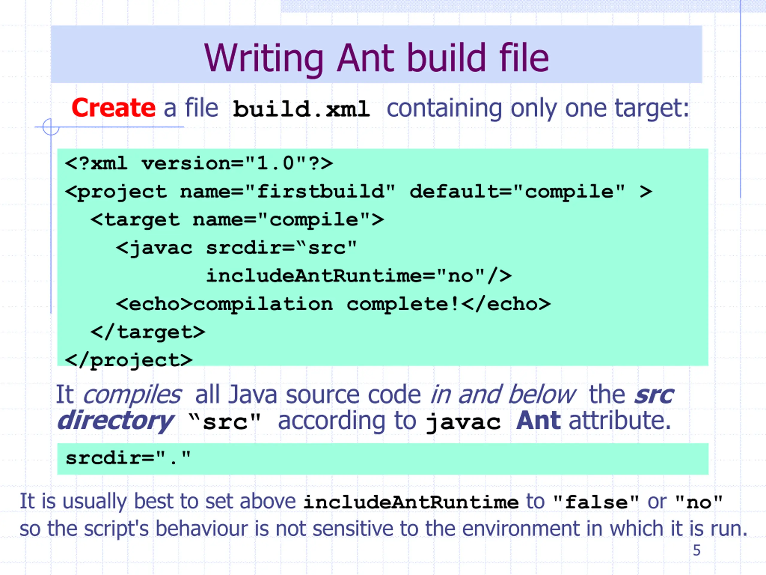 Writing Ant build file Create a filebuild.xmlcontaining only one target: <?xml version="1.0"?> <project name="firstbuild" default="compile" > <target name="compile"> <javac srcdir= src" includeAntRuntime="no"/> <echo>compilation complete!</echo> </target> </project> It compiles all Java source code in and below the src directory src"according to javac Ant attribute. srcdir="." It is usually best to set above includeAntRuntime to "false" or "no" so the script's behaviour is not sensitive to the environment in which it is run. 5