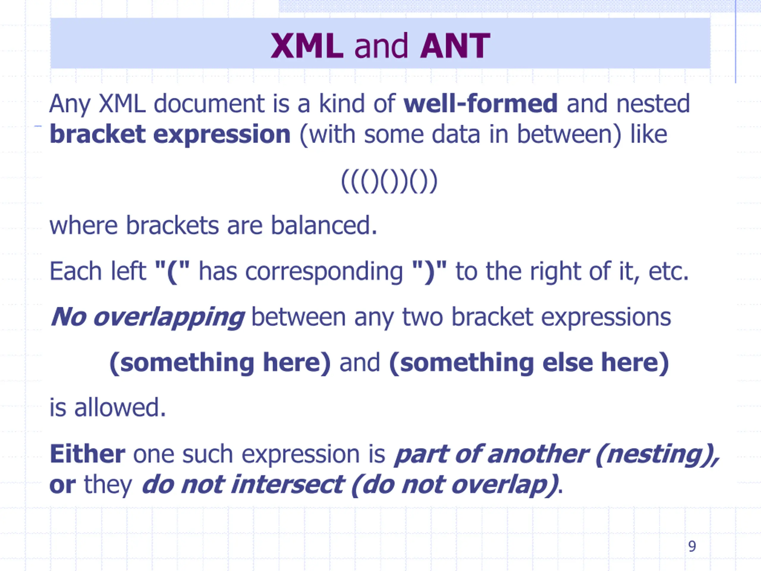 XML and ANT Any XML document is a kind of well-formed and nested bracket expression (with some data in between) like ((()())()) where brackets are balanced. Each left "(" has corresponding ")" to the right of it, etc. No overlapping between any two bracket expressions (something here) and (something else here) is allowed. Either one such expression is part of another (nesting), or they do not intersect (do not overlap). 9