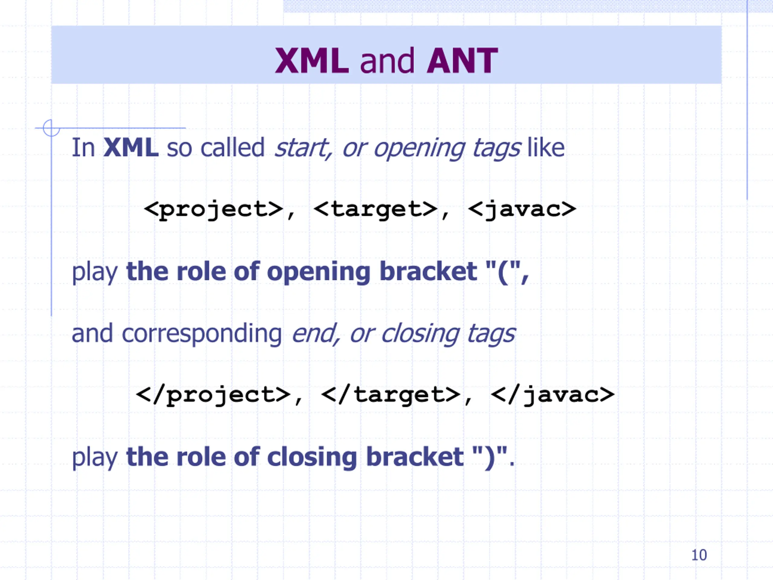XML and ANT In XML so called start, or opening tags like <project>, <target>, <javac> play the role of opening bracket "(", and corresponding end, or closing tags </project>, </target>, </javac> play the role of closing bracket ")". 10