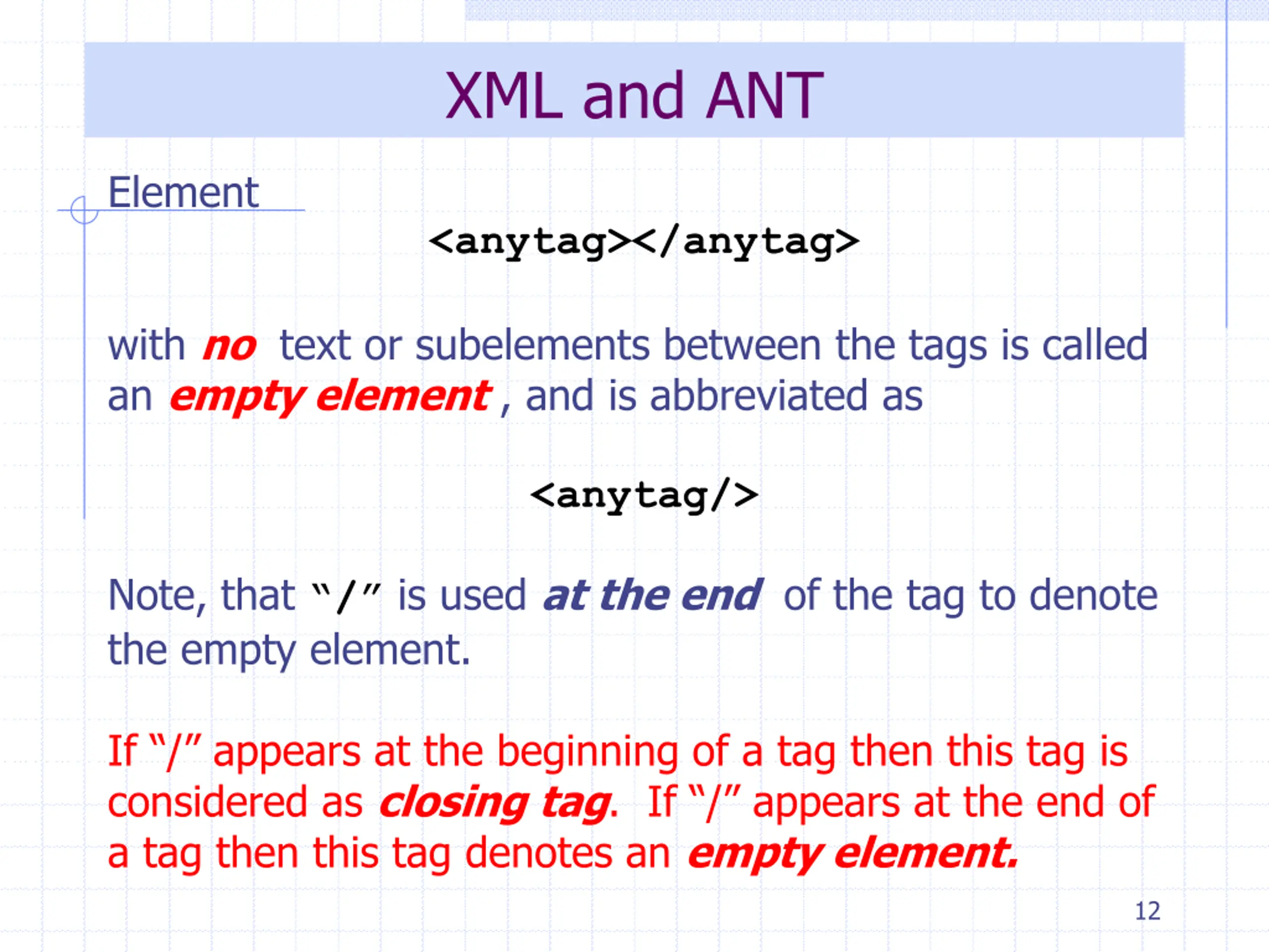 XML and ANT Element <anytag></anytag> with no text or subelements between the tags is called an empty element , and is abbreviated as <anytag/> Note, that / is used at the end of the tag to denote the empty element. If / appears at the beginning of a tag then this tag is considered as closing tag. If / appears at the end of a tag then this tag denotes an empty element. 12