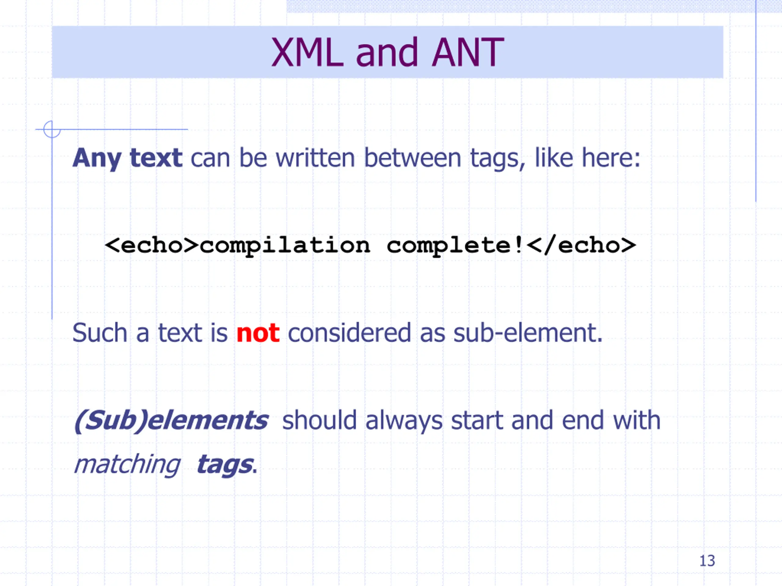 XML and ANT Any text can be written between tags, like here: <echo>compilation complete!</echo> Such a text is not considered as sub-element. (Sub)elements should always start and end with matching tags. 13