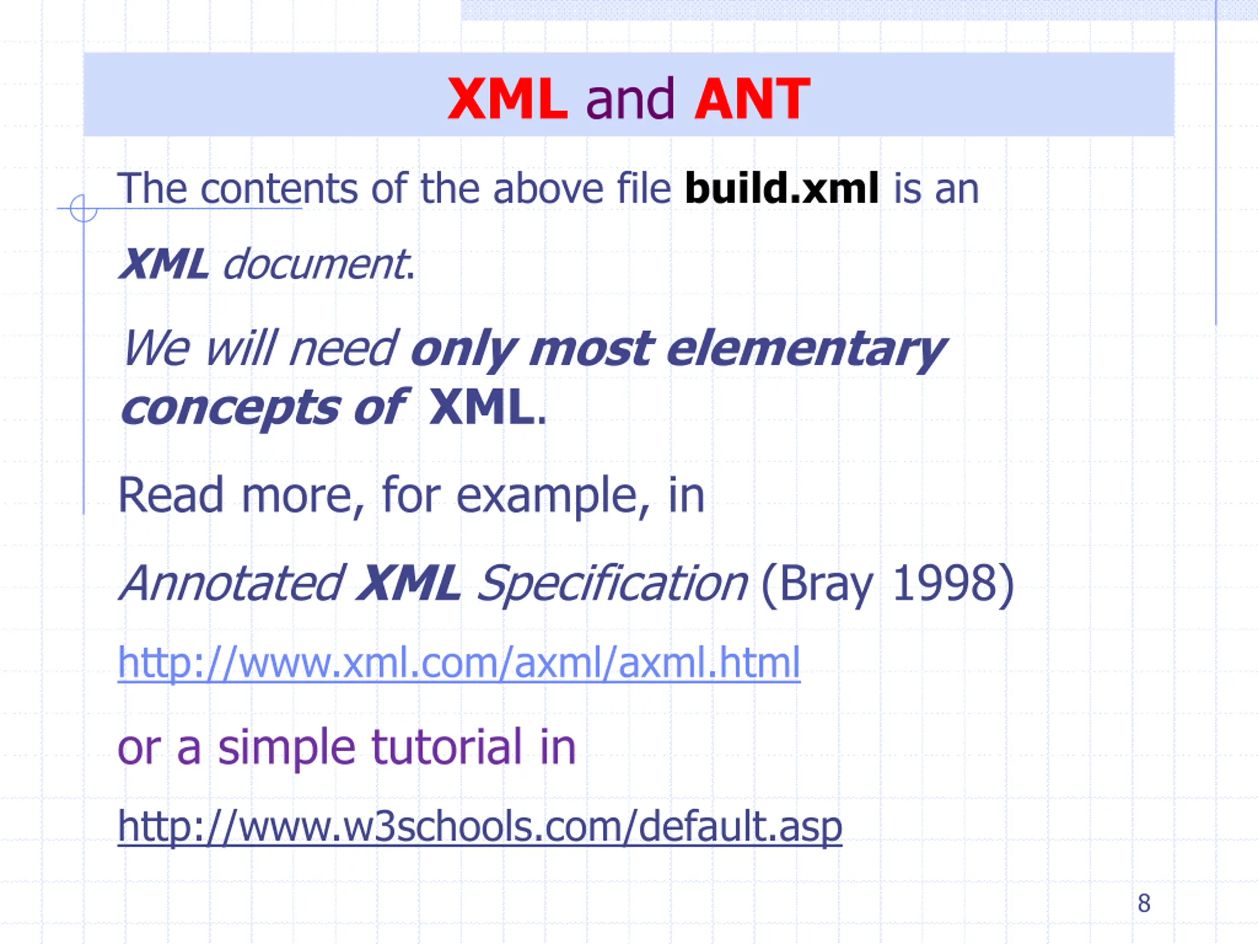 XML and ANT The contents of the above file build.xml is an XML document. We will need only most elementary concepts ofXML. Read more, for example, in Annotated XML Specification (Bray 1998) http://www.xml.com/axml/axml.html or a simple tutorial in http://www.w3schools.com/default.asp 8