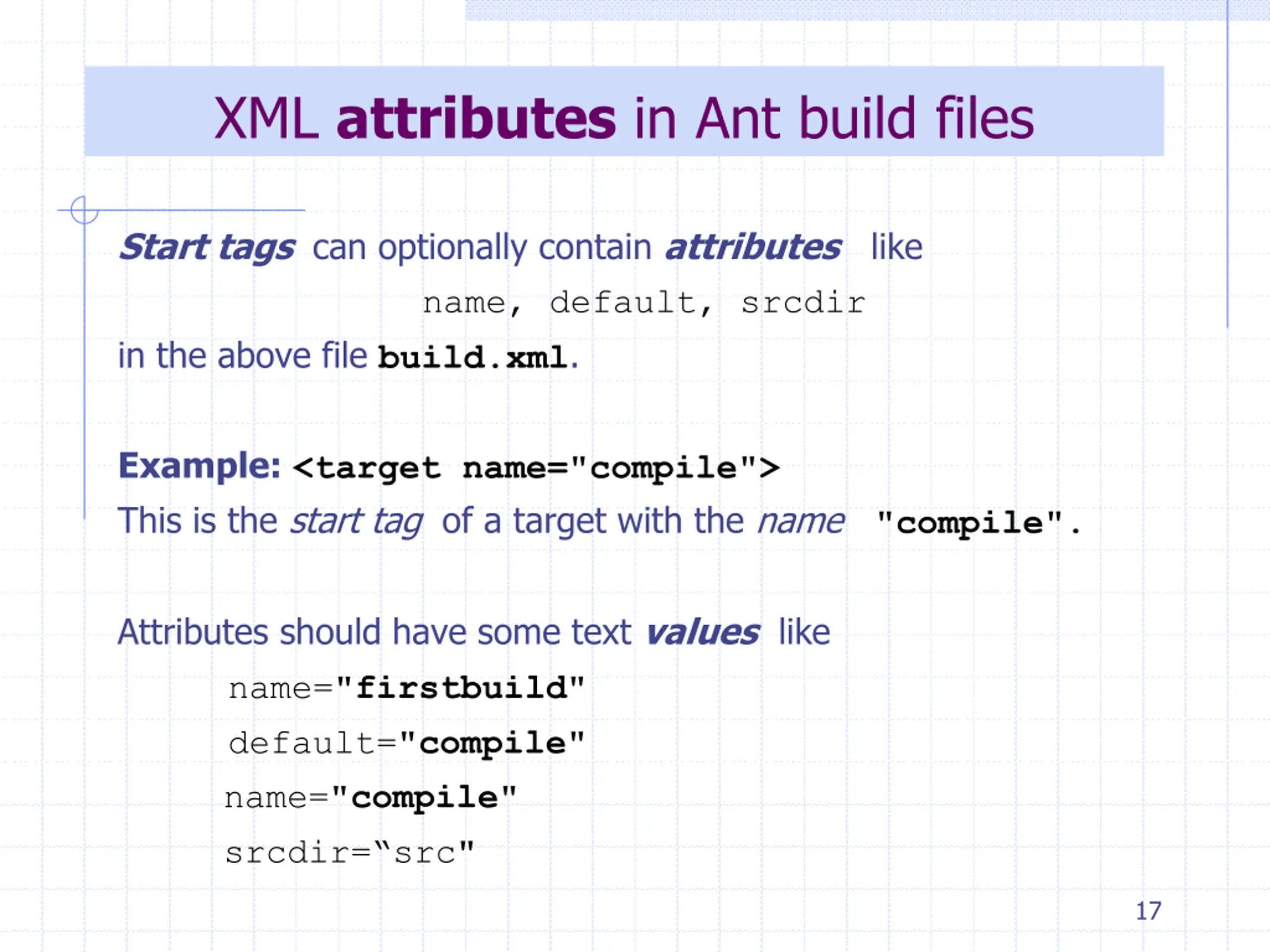 XML attributes in Ant build files Start tags can optionally contain attributes like name, default, srcdir in the above file build.xml. Example:<target name="compile"> This is the start tag of a target with the name "compile". Attributes should have some text values like name="firstbuild" default="compile" name="compile" srcdir= src" 17