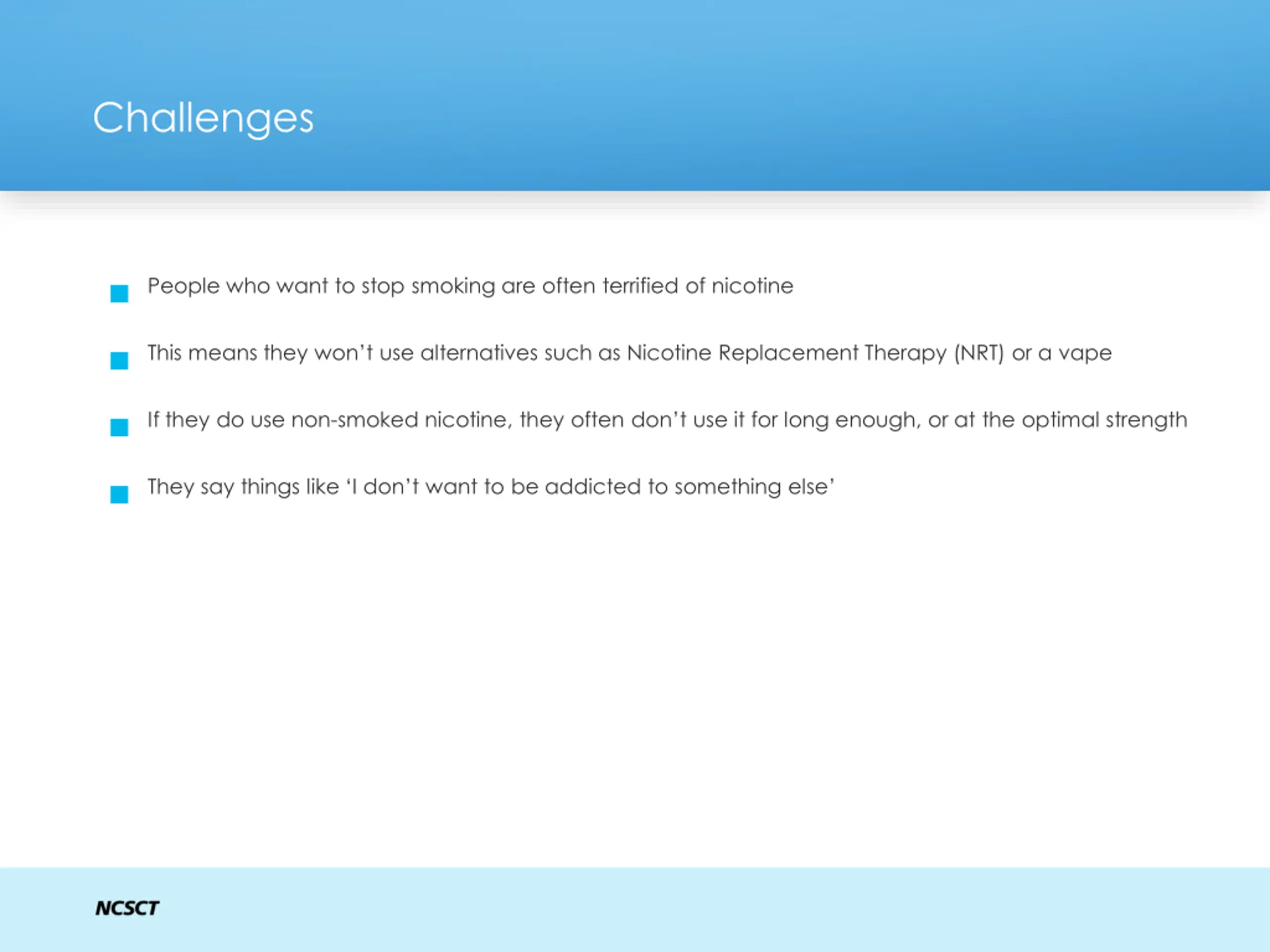 Challenges People who want to stop smoking are often terrified of nicotine This means they won t use alternatives such as Nicotine Replacement Therapy (NRT) or a vape If they do use non-smoked nicotine, they often don t use it for long enough, or at the optimal strength They say things like I don t want to be addicted to something else
