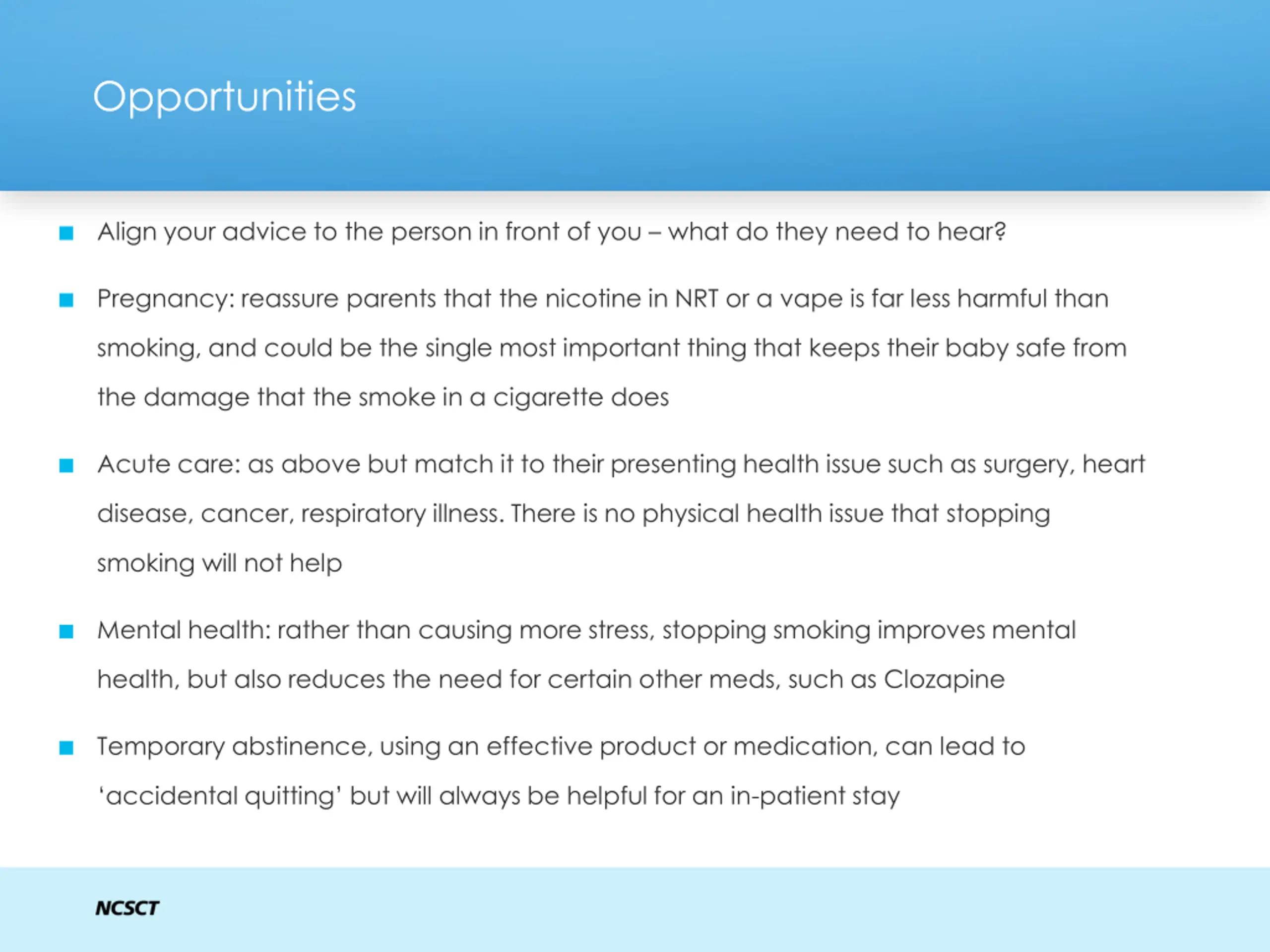 Opportunities Align your advice to the person in front of you what do they need to hear? Pregnancy: reassure parents that the nicotine in NRT or a vape is far less harmful than smoking, and could be the single most important thing that keeps their baby safe from the damage that the smoke in a cigarette does Acute care: as above but match it to their presenting health issue such as surgery, heart disease, cancer, respiratory illness. There is no physical health issue that stopping smoking will not help Mental health: rather than causing more stress, stopping smoking improves mental health, but also reduces the need for certain other meds, such as Clozapine Temporary abstinence, using an effective product or medication, can lead to accidental quitting but will always be helpful for an in-patient stay