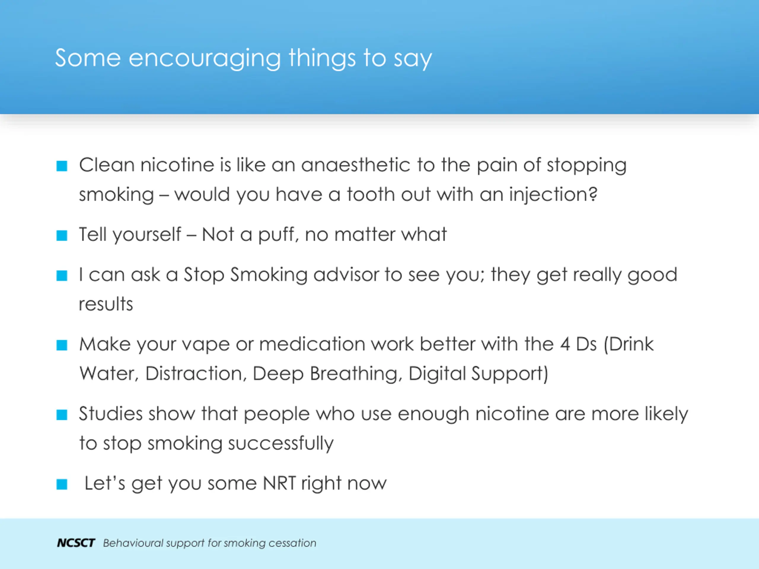 Some encouraging things to say Clean nicotine is like an anaesthetic to the pain of stopping smoking would you have a tooth out with an injection? Tell yourself Not a puff, no matter what I can ask a Stop Smoking advisor to see you; they get really good results Make your vape or medication work better with the 4 Ds (Drink Water, Distraction, Deep Breathing, Digital Support) Studies show that people who use enough nicotine are more likely to stop smoking successfully Let s get you some NRT right now Behavioural support for smoking cessation