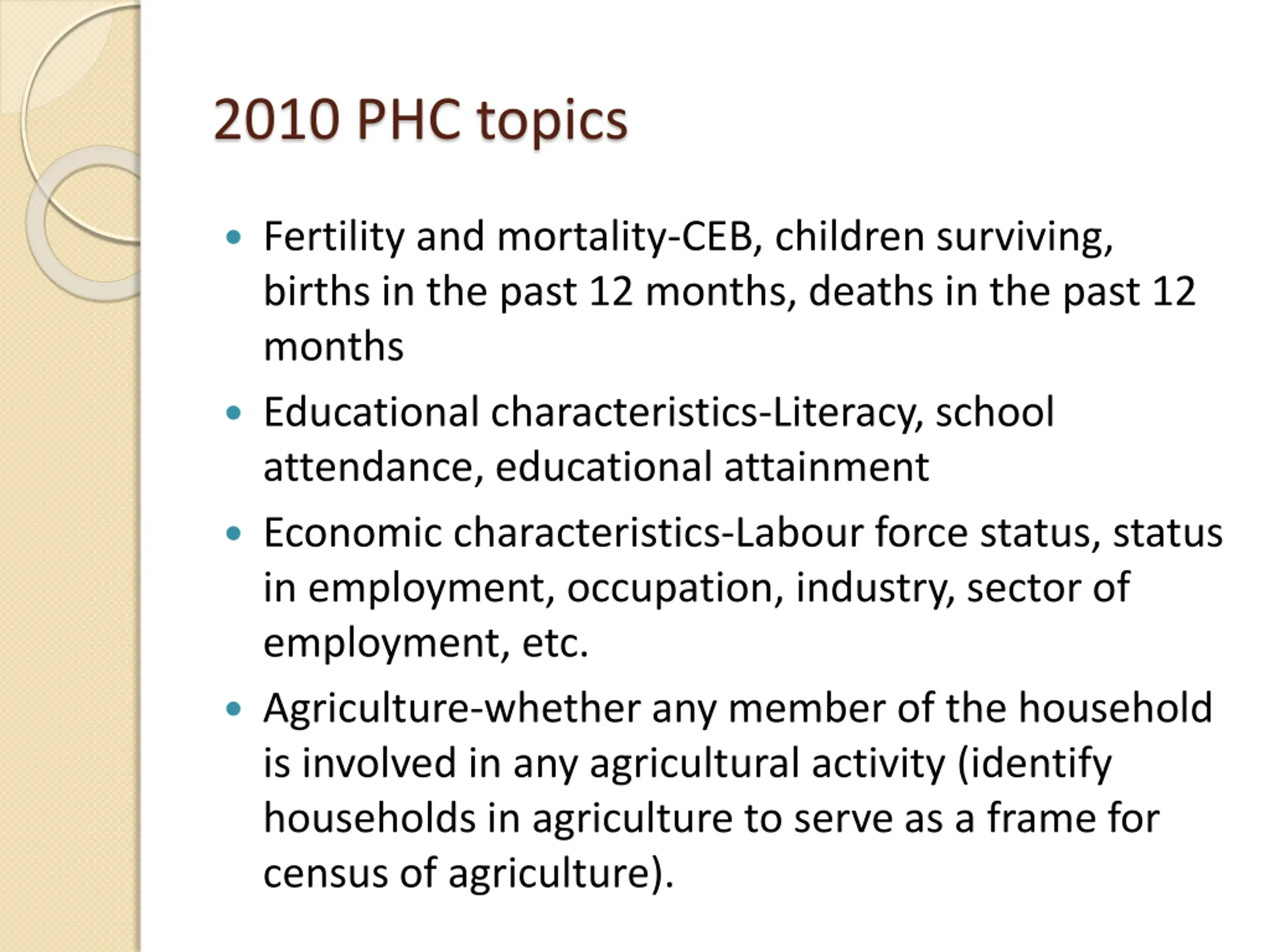 2010 PHC topics Fertility and mortality-CEB, children surviving, births in the past 12 months, deaths in the past 12 months Educational characteristics-Literacy, school attendance, educational attainment Economic characteristics-Labour force status, status in employment, occupation, industry, sector of employment, etc. Agriculture-whether any member of the household is involved in any agricultural activity (identify households in agriculture to serve as a frame for census of agriculture).
