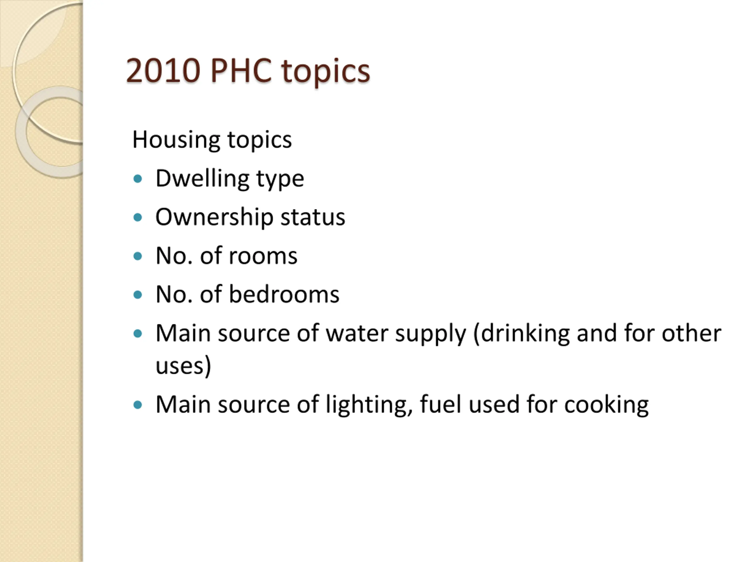 2010 PHC topics Housing topics Dwelling type Ownership status No. of rooms No. of bedrooms Main source of water supply (drinking and for other uses) Main source of lighting, fuel used for cooking