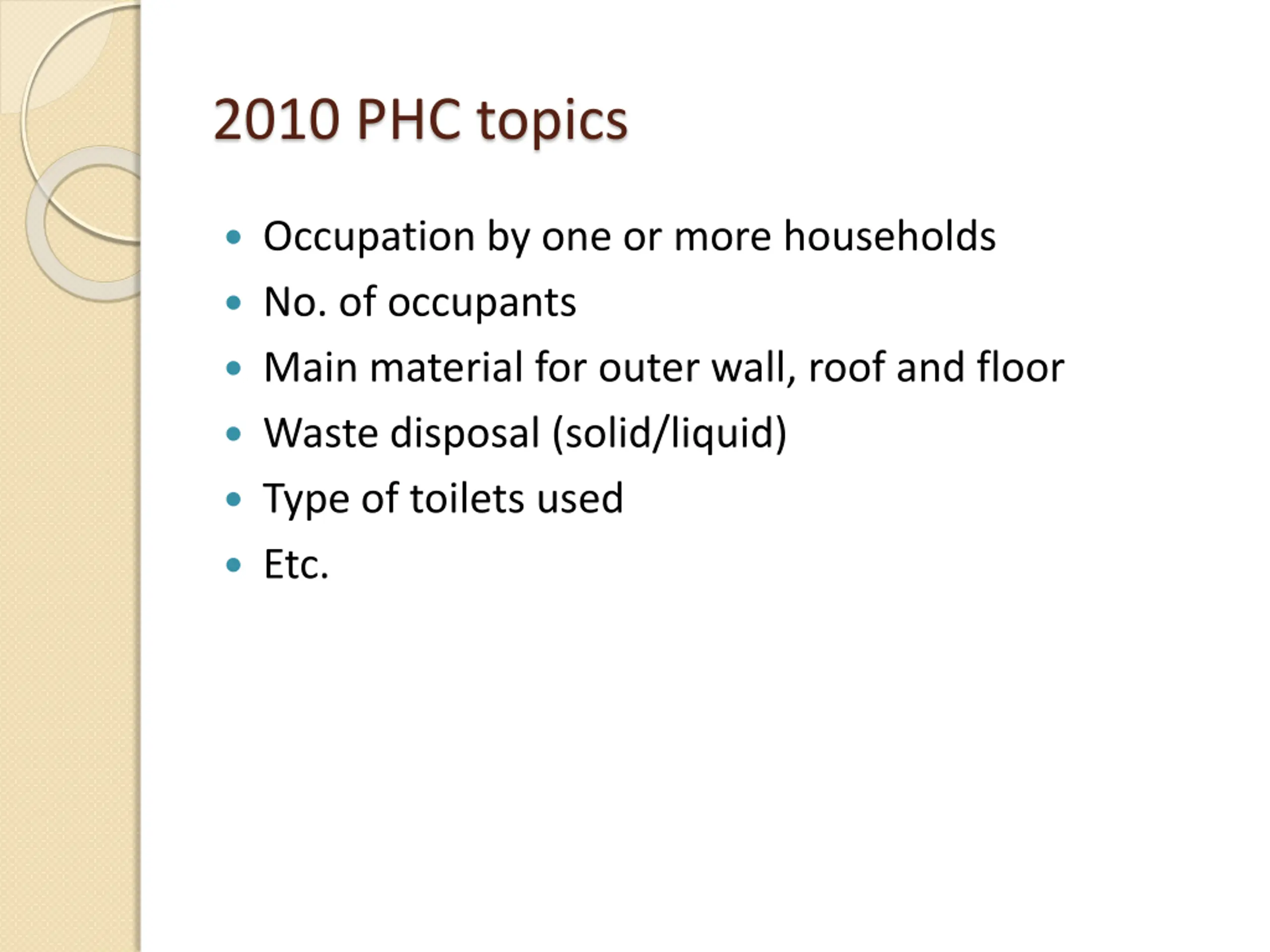 2010 PHC topics Occupation by one or more households No. of occupants Main material for outer wall, roof and floor Waste disposal (solid/liquid) Type of toilets used Etc.