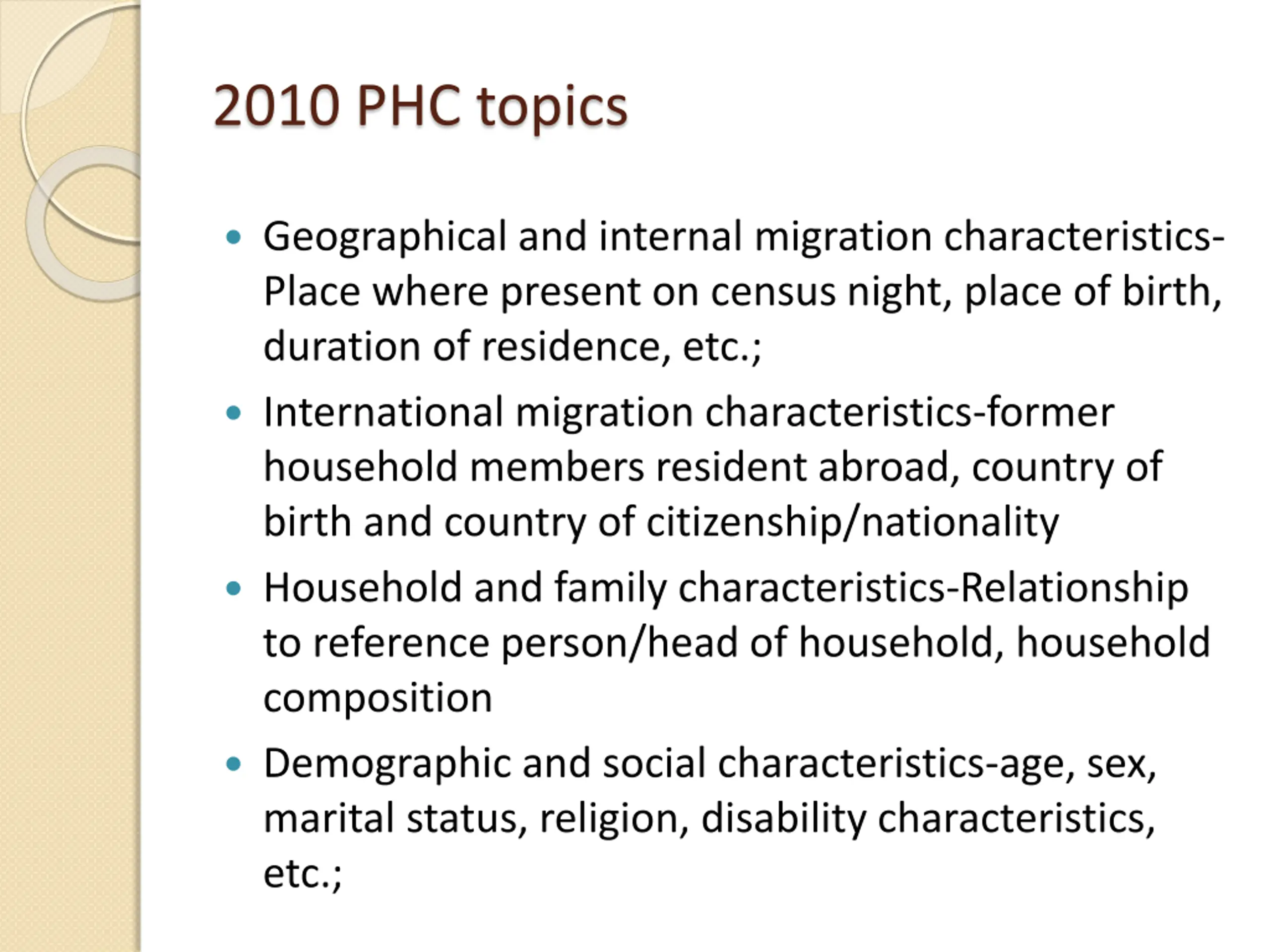 2010 PHC topics Geographical and internal migration characteristics- Place where present on census night, place of birth, duration of residence, etc.; International migration characteristics-former household members resident abroad, country of birth and country of citizenship/nationality Household and family characteristics-Relationship to reference person/head of household, household composition Demographic and social characteristics-age, sex, marital status, religion, disability characteristics, etc.;